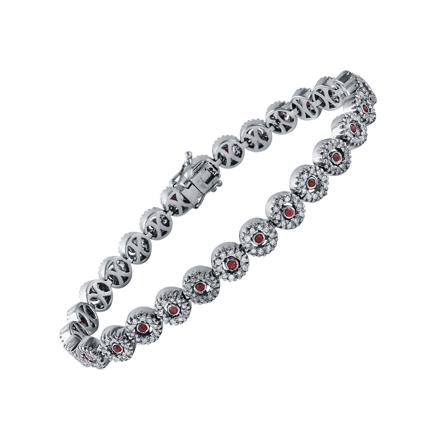 18KT White Gold Ruby and Diamond Bracelet. (28) Rubies with a total weight of 0.52cts. (280) Round Diamonds with a total weight of 1.56cts with a color of I and clarity of I-1. Total length of this bracelet is 7.25 inches. Total weight of this bracelet is 23.31 grams.