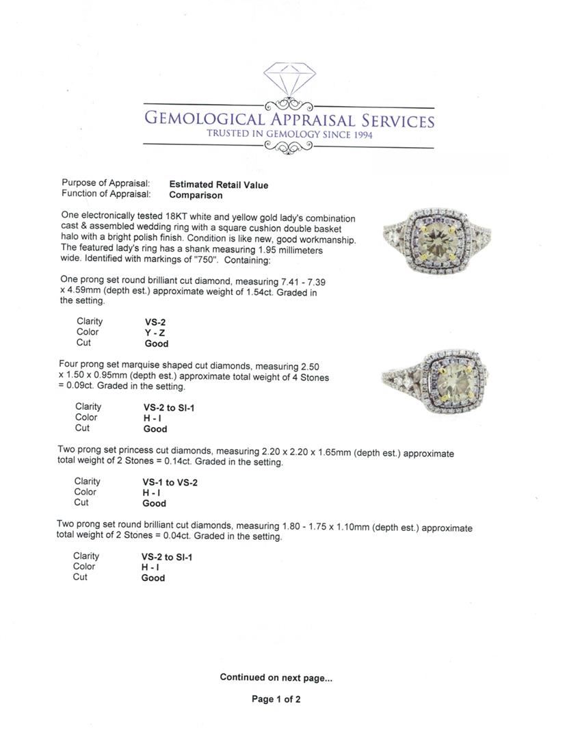 One electronically tested 18KT white and yellow gold lady's combination cast & assembled wedding ring with a square cushion double basket halo with a bright polish finish. The featured lady's ring has a shank measuring 1.95 millimeters wide. Identified with markings of '750'. Condition is like new, good workmanship. Containing: One prong set round brilliant cut diamond, measuring 7.41 - 7.39 x 4.59mm (depth est.) approximate weight of 1.54ct. Graded in the setting. Color Y - Z Clarity VS-2 Cut Good Four prong set marquise shaped cut diamonds, measuring 2.50 x 1.50 x 0.95mm (depth est.) approximate total weight of 4 Stones = 0.09ct. Graded in the setting. Color H - I Clarity VS-2 to SI-1 Cut Good Two prong set princess cut diamonds, measuring 2.20 x 2.20 x 1.65mm (depth est.) approximate total weight of 2 Stones = 0.14ct. Graded in the setting. Color H - I Clarity VS-1 to VS-2 Cut Good Two prong set round brilliant cut diamonds, measuring 1.80 - 1.75 x 1.10mm (depth est.) approximate total weight of 2 Stones = 0.04ct. Graded in the setting. Color H - I Clarity VS-2 to SI-1 Cut Good Sixteen prong set round brilliant cut diamonds, measuring 1.50 - 1.45 x 0.92mm (depth est.) approximate total weight of 16 Stones = 0.20ct. Graded in the setting. Color H - I Clarity SI-1 to SI-2 Cut Very Good One Hundred prong set round brilliant cut diamonds, measuring 1.20 - 1.00 x 0.68mm (depth est.) approximate total weight of 100 Stones = 0.50ct. Graded in the setting. Color H - I Clarity VS-2 to SI-1 Cut Good. Total Weight of Diamonds 2.51ct. Total Weight of Ring 6.20gm. GAS Appraised.