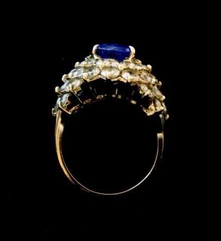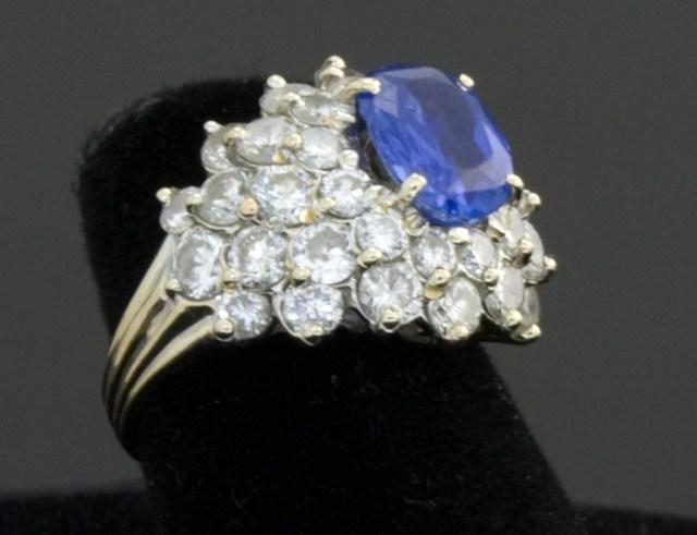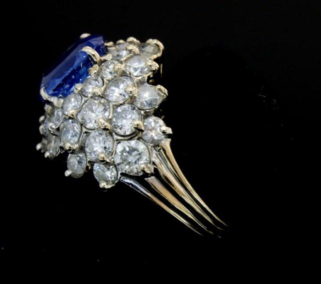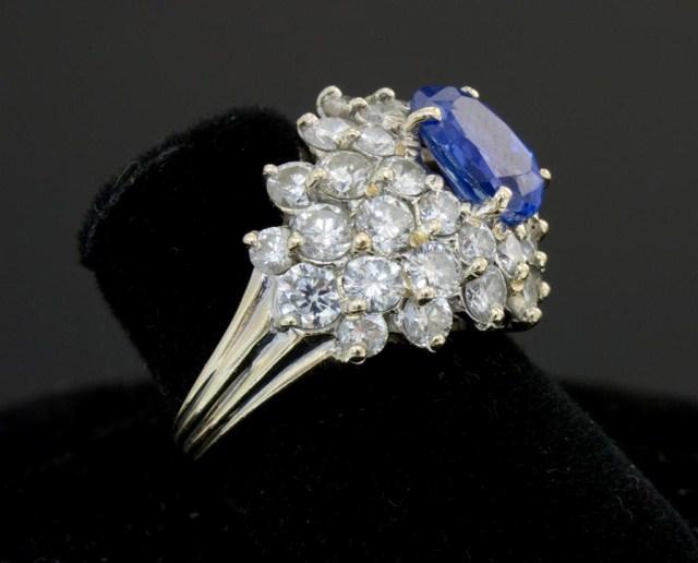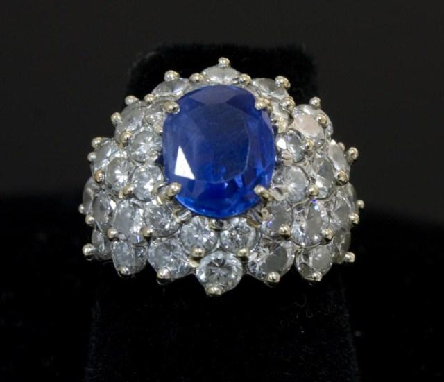 Estate Sapphire and Diamond cocktail ring. 18kt white gold setting. Having approximately 2.8ct center Ceylon sapphire and approximately 3ct accent diamonds. Ring size 6 1/2.