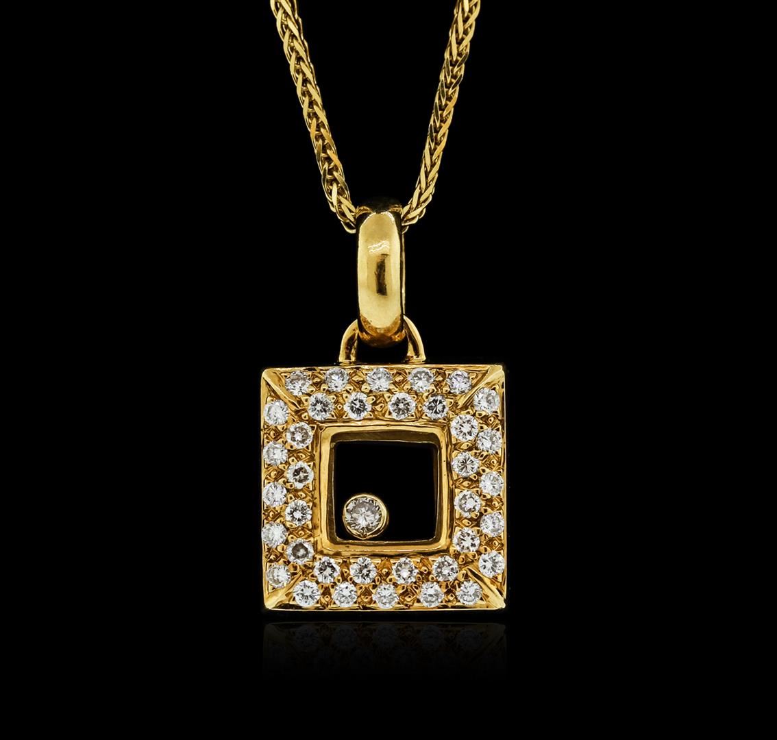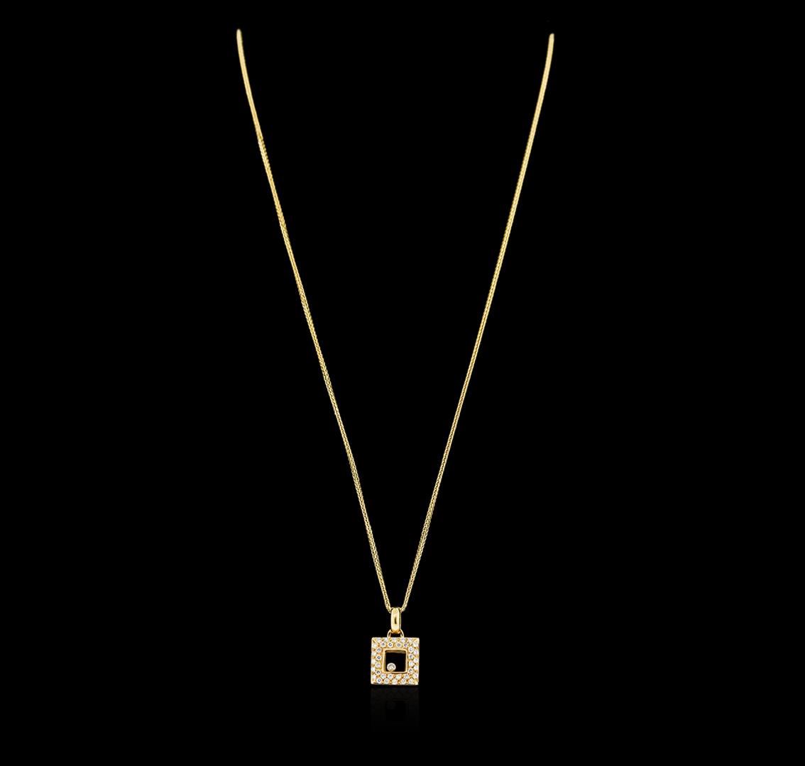 One electronically tested 18KT yellow gold ladies cast diamond pendant & chain 17.5" long, with a lobster claw clasp with a bright polish finish. Identified with markings of "18K". Condition is new. Containing: Thirty-Six prong set round brilliant cut diamonds, measuring 1.00 - 1.00 x 0.60mm (depth est.) approximate total weight of 36 Stones = 0.13ct. Clarity: SI-1 to SI-2. Color: F - G. One bezel set round brilliant cut diamond, measuring 2.00 - 2.00 x 1.20mm (depth est.) approximate weight of 0.03ct. Clarity: SI-2. Color: I. All diamonds are graded in the mounting, unless otherwise stated. Total Weight of Diamonds 0.16ct. Total Weight of Pendant & Chain 8.80 grams. GGL Appraised at $3,240.00.