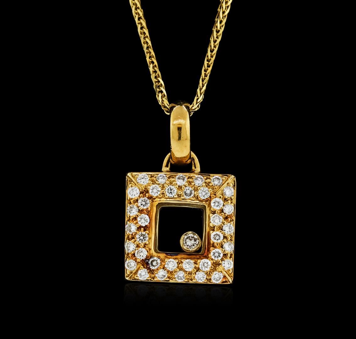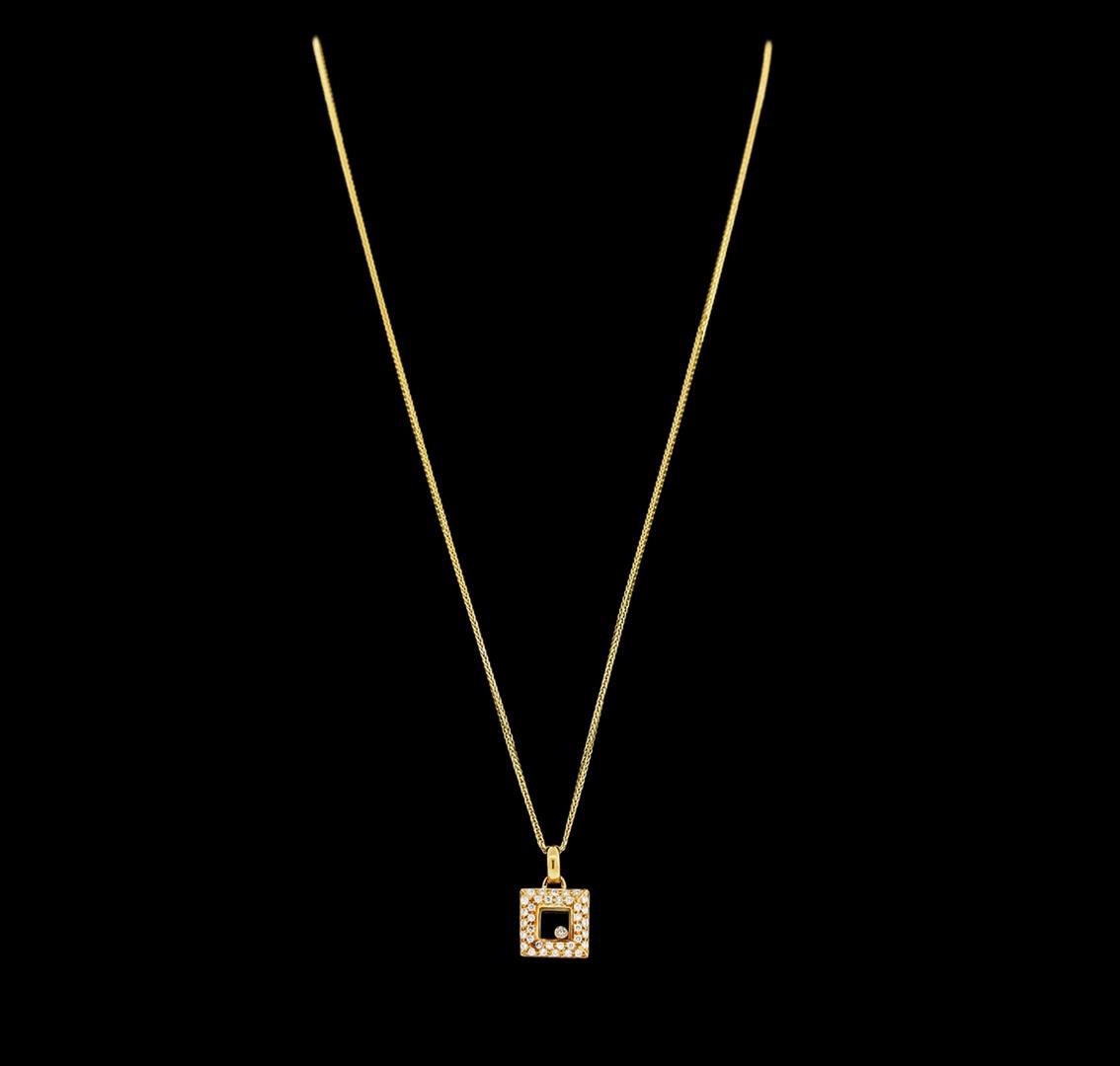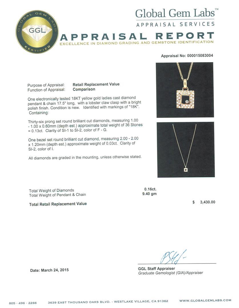 One electronically tested 18KT yellow gold ladies cast diamond pendant & chain 17.5" long, with a lobster claw clasp with a bright polish finish. Identified with markings of "18K". Condition is new. Containing: Thirty-Six prong set round brilliant cut diamonds, measuring 1.00 - 1.00 x 0.60mm (depth est.) approximate total weight of 36 Stones = 0.13ct. Clarity: SI-1 to SI-2. Color: F - G. One bezel set round brilliant cut diamond, measuring 2.00 - 2.00 x 1.20mm (depth est.) approximate weight of 0.03ct. Clarity: SI-2. Color: I. All diamonds are graded in the mounting, unless otherwise stated. Total Weight of Diamonds 0.16ct. Total Weight of Pendant & Chain 9.40 grams. GGL Appraised at $3,430.00.