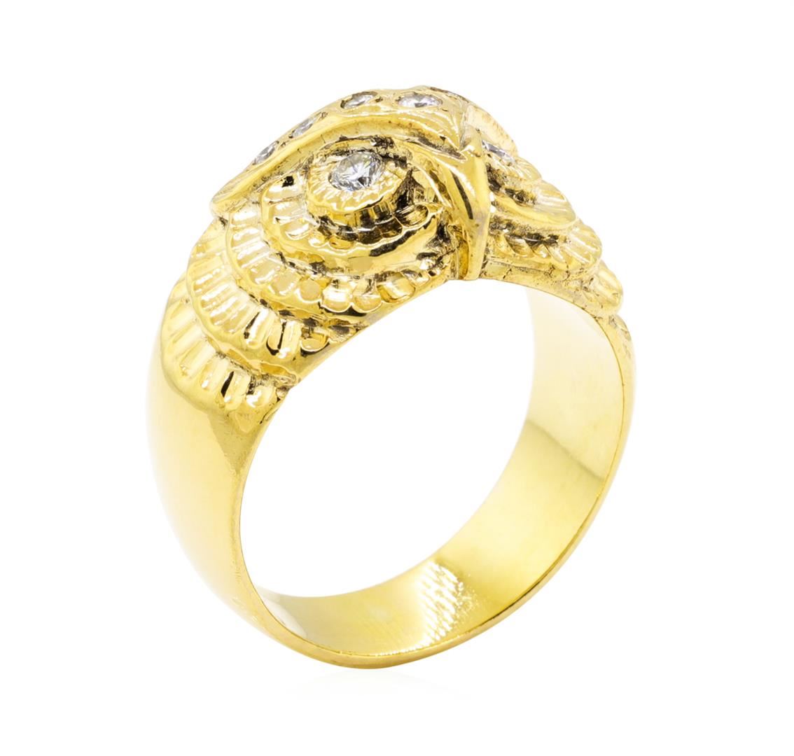 One ring featuring: 18KT yellow gold weighing 20.8 grams containing diamonds weighing 0.25ctw. The ring is a size 10.