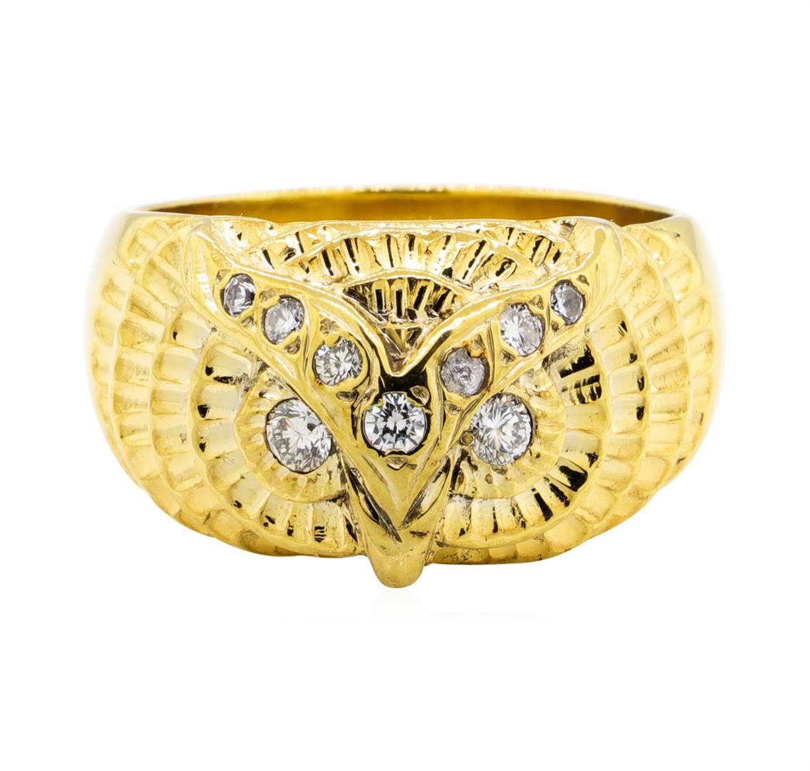 One ring featuring: 18KT yellow gold weighing 20.8 grams containing diamonds weighing 0.25ctw. The ring is a size 10.