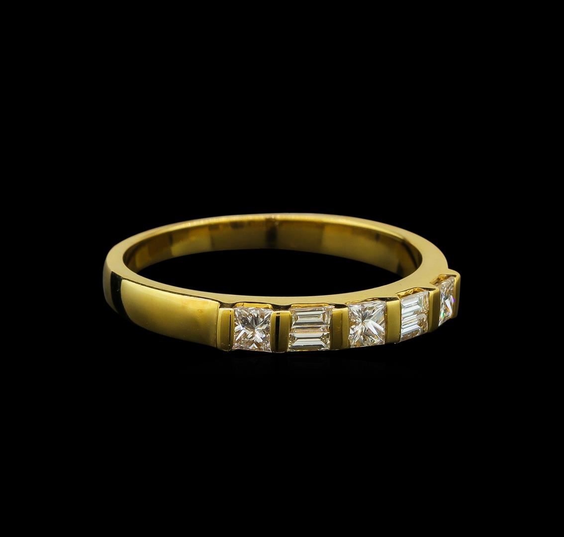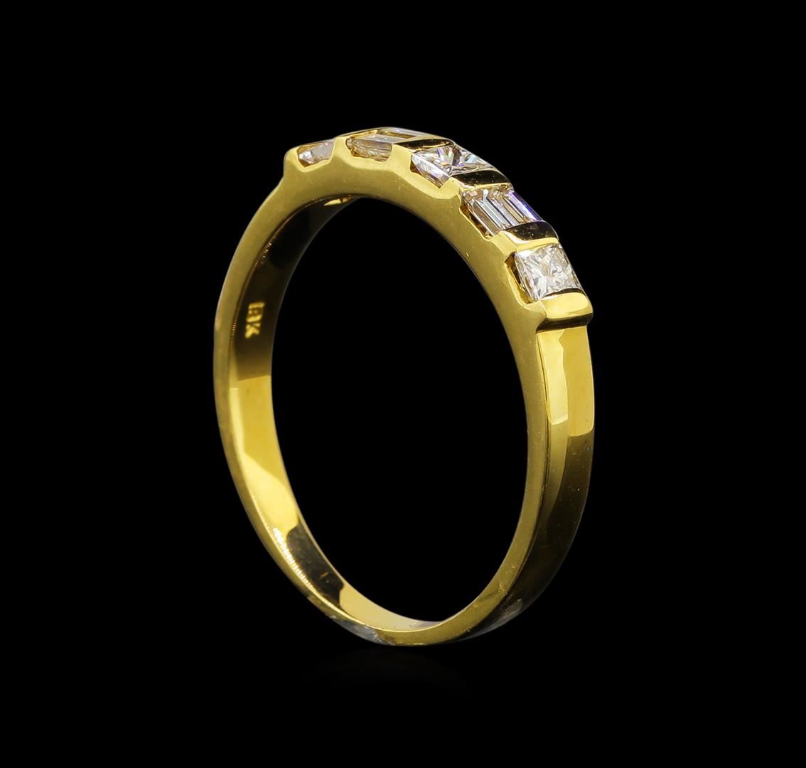 One electronically tested 18KT yellow gold ladies cast diamond ring with a flat shank with rounded edges with a bright polish finish. Identified with markings of "18K". Condition is new. Containing: Three channel set princess cut diamonds, measuring 2.50 x 2.50 x 1.88mm (depth est.) approximate total weight of 3 Stones = 0.29ct. Clarity: VS-2. Color: I - J, Cut is Good. Four baguette cut diamonds, measuring 2.00 x 1.30 x 1.11mm (depth est.) approximate total weight of 4 Stones = 0.11ct. Diamonds are graded in the mounting, unless otherwise stated. Total Weight of Diamonds 0.40ct. Total Weight of Ring 3.10 grams. GGL Appraised at $1,620.00.
