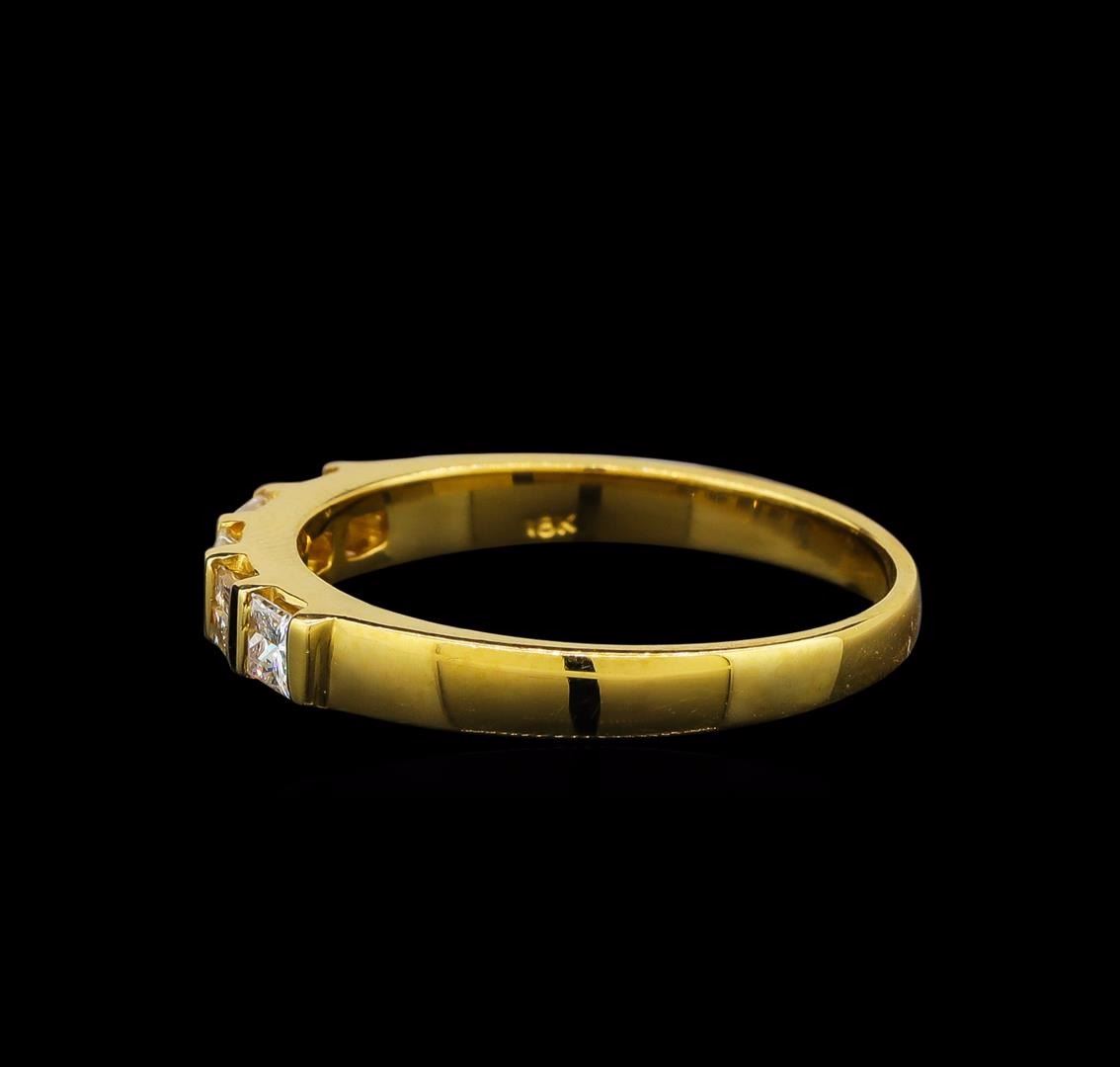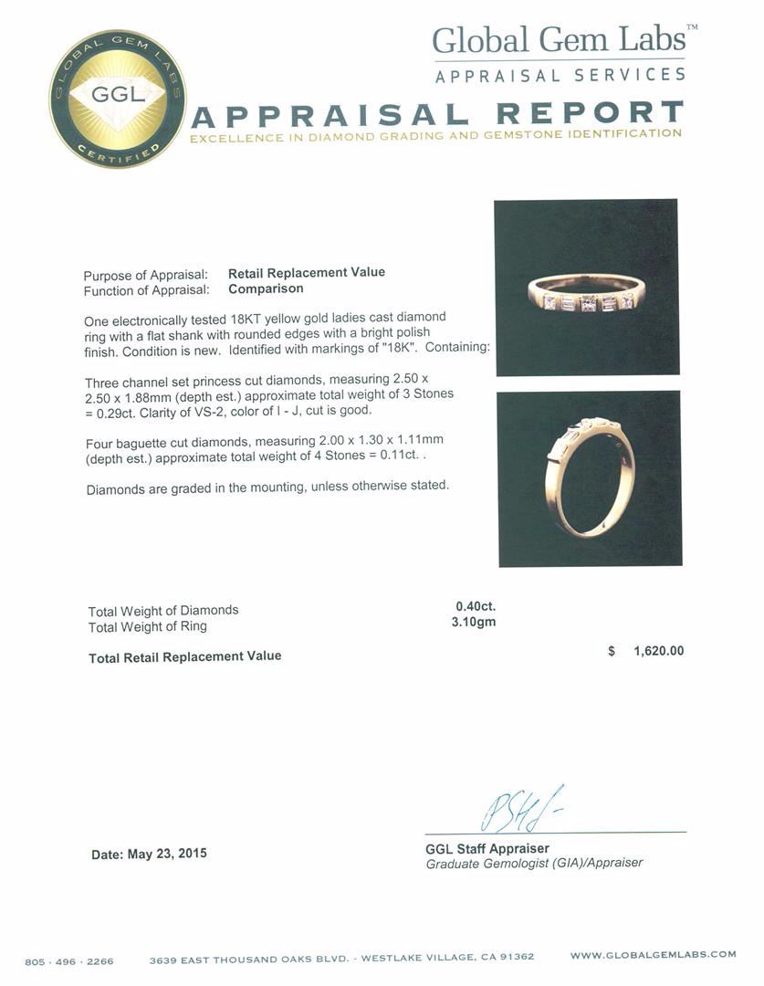 One electronically tested 18KT yellow gold ladies cast diamond ring with a flat shank with rounded edges with a bright polish finish. Identified with markings of "18K". Condition is new. Containing: Three channel set princess cut diamonds, measuring 2.50 x 2.50 x 1.88mm (depth est.) approximate total weight of 3 Stones = 0.29ct. Clarity: VS-2. Color: I - J, Cut is Good. Four baguette cut diamonds, measuring 2.00 x 1.30 x 1.11mm (depth est.) approximate total weight of 4 Stones = 0.11ct. Diamonds are graded in the mounting, unless otherwise stated. Total Weight of Diamonds 0.40ct. Total Weight of Ring 3.10 grams. GGL Appraised at $1,620.00.