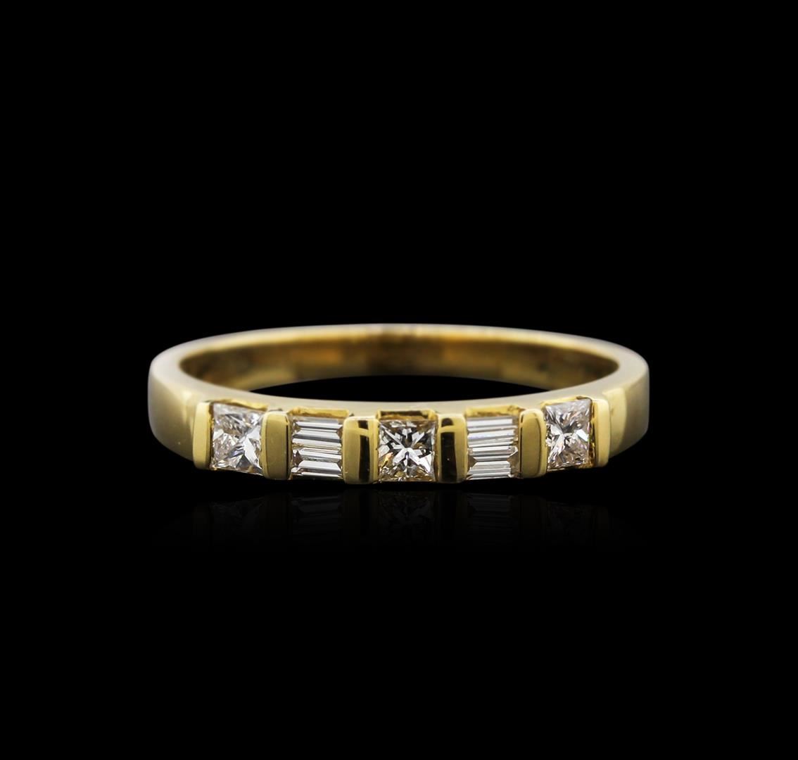 One electronically tested 18KT yellow gold ladies cast diamond ring with a flat shank with rounded edges with a bright polish finish. Identified with markings of "18K". Condition is new. Containing: Three channel set princess cut diamonds, measuring 2.50 x 2.50 x 1.88mm (depth est.) approximate total weight of 3 Stones = 0.29ct. Clarity: VS-2. Color: I - J, Cut is Good. Four baguette cut diamonds, measuring 2.00 x 1.30 x 1.11mm (depth est.) approximate total weight of 4 Stones = 0.11ct. Diamonds are graded in the mounting, unless otherwise stated. Total Weight of Diamonds 0.40ct. Total Weight of Ring 3.10 grams. GGL Appraised at $1,620.00.