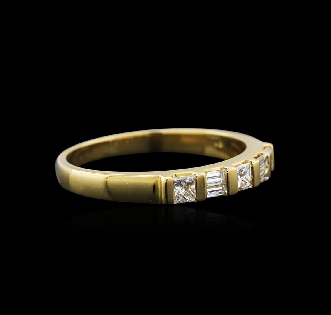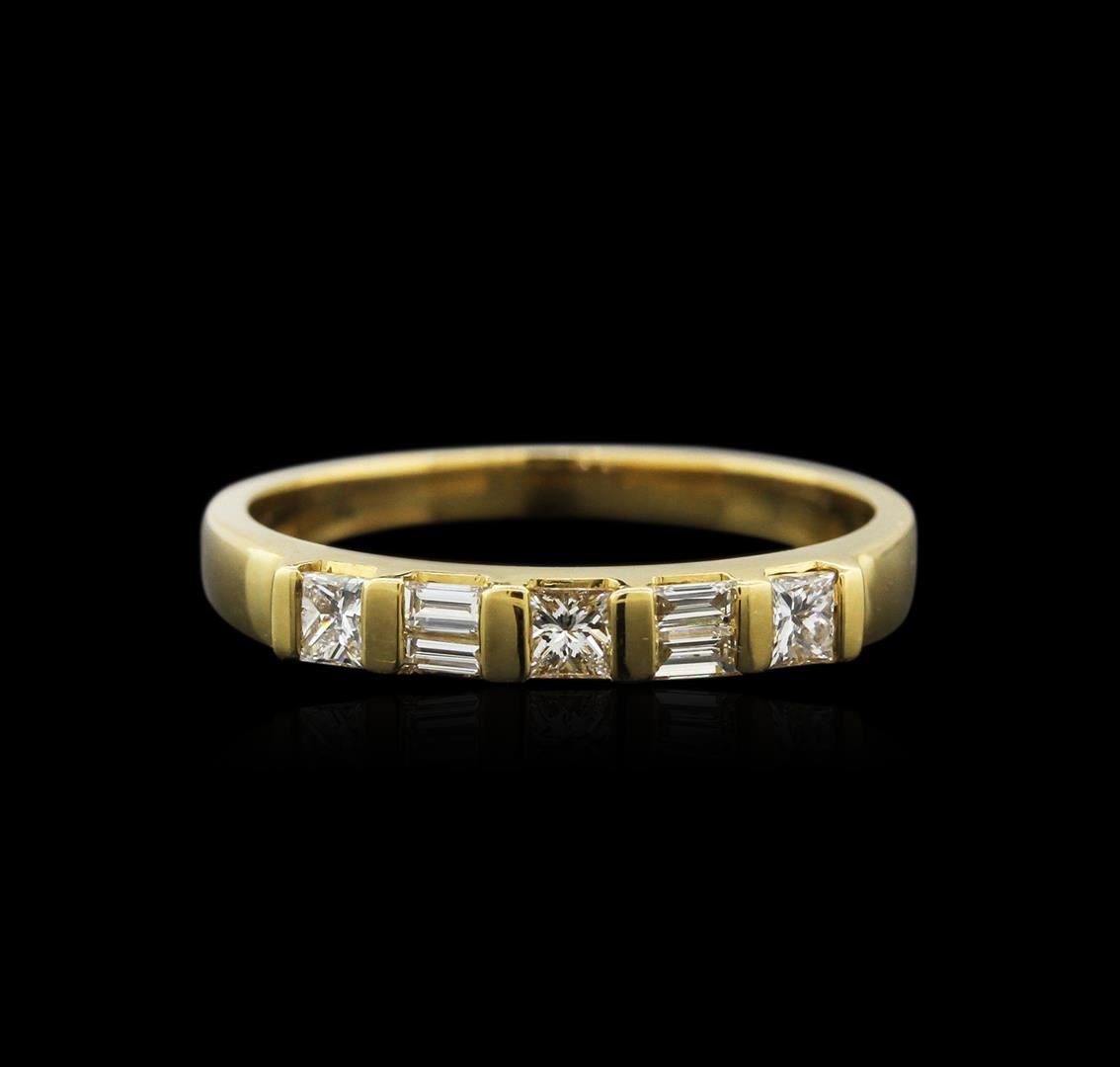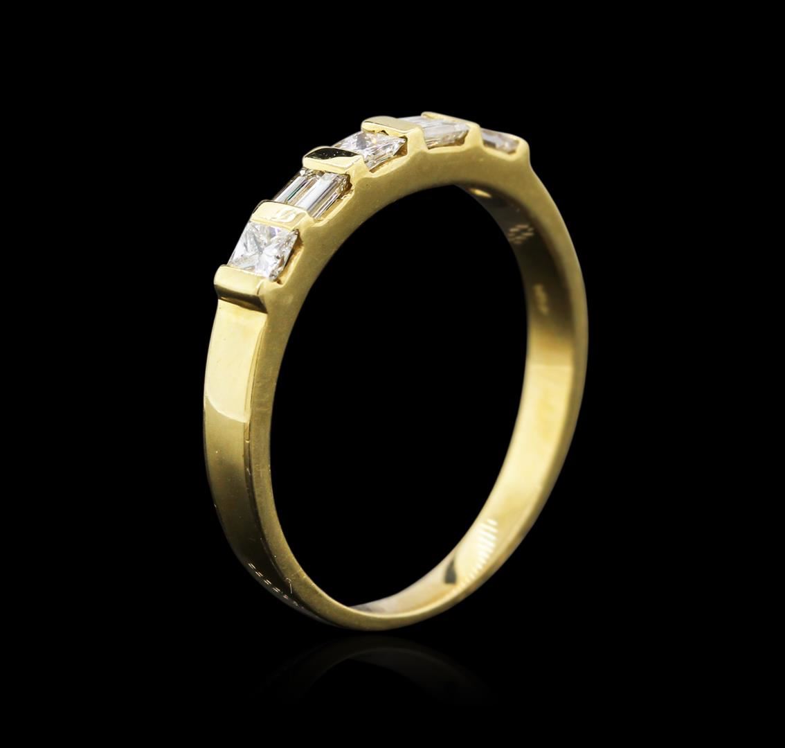 One electronically tested 18KT yellow gold ladies cast diamond ring with a flat shank with rounded edges with a bright polish finish. Identified with markings of "18K". Condition is new. Containing: Three channel set princess cut diamonds, measuring 2.50 x 2.50 x 1.88mm (depth est.) approximate total weight of 3 Stones = 0.29ct. Clarity: VS-2. Color: I - J, Cut is Good. Four baguette cut diamonds, measuring 2.00 x 1.30 x 1.11mm (depth est.) approximate total weight of 4 Stones = 0.11ct. Diamonds are graded in the mounting, unless otherwise stated. Total Weight of Diamonds 0.40ct. Total Weight of Ring 3.10 grams. GGL Appraised at $1,620.00.