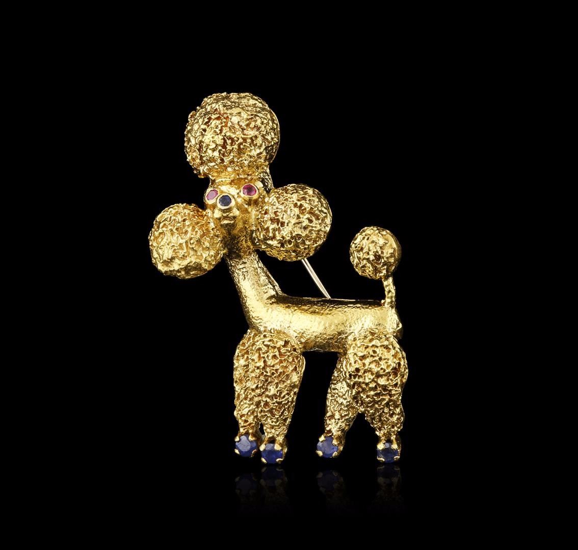 One electronically tested 18KT yellow gold ladies cast & assembled sapphire and ruby brooch. The brooch features a poodle design. The feet and the nose of the poodle are set with sapphires and the eyes are set with rubies. The brooch is completed by a horizontally placed pin. Area measurements 2.00 x 1.25 inch. Bright polish finish. Identified with markings of "18K". Condition is good. Containing: Four prong set round mixed cut natural blue sapphires, measuring 2.80 - 2.70 x 1.79 mm, approximate total weight of 0.44ct., clarity is moderately included, type II, medium dark, very slightly grayish, violetish blue color, (GIA vB 6/3), cut is good. Transmitting light somewhat diffusely, transparent to translucent. Naturally occurring internal & external characteristics are present. Color grade is an average for the group. Graded in the setting. One bezel set round mixed cut natural blue sapphire, measuring 1.80 - 1.80 x 1.17 mm, approximate weight of 0.03ct., clarity is moderately included, type II, medium dark, very slightly grayish, violetish blue color, (GIA vB 6/3), cut is good. Transmitting light somewhat diffusely, transparent to translucent. Naturally occurring internal & external characteristics are present. Graded in the setting. Two bezel set round mixed cut natural rubies, measuring 2.00 - 1.90 x 1.27 mm, approximate total weight of 0.08ct., clarity is slightly included, type II, medium dark, very slightly brownish, slightly purplish red color, (GIA slpR 6/3), cut is good. Transmitting light with a minimum of distortion, transparent. Naturally occurring internal & external characteristics are present. Color grade is an average for the pair. Graded in the setting. Total Weight of Colored Stones 0.55ct. Total Weight of Brooch 19.72 grams. AIG Appraised at $4,285.00.