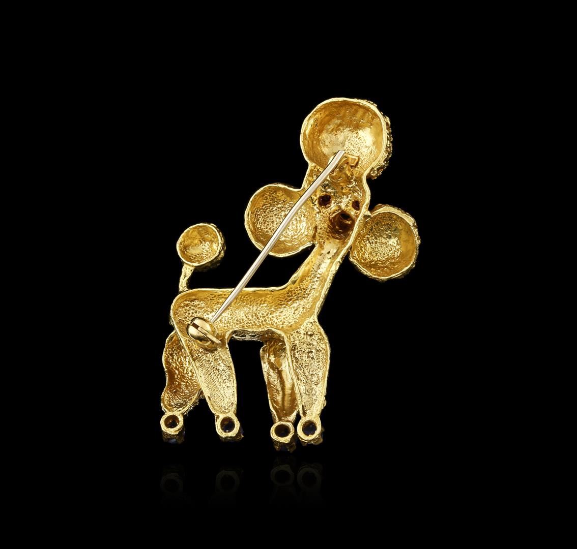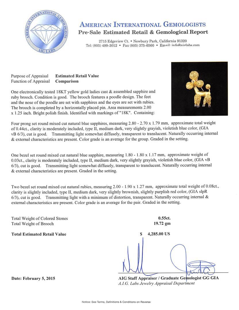 One electronically tested 18KT yellow gold ladies cast & assembled sapphire and ruby brooch. The brooch features a poodle design. The feet and the nose of the poodle are set with sapphires and the eyes are set with rubies. The brooch is completed by a horizontally placed pin. Area measurements 2.00 x 1.25 inch. Bright polish finish. Identified with markings of "18K". Condition is good. Containing: Four prong set round mixed cut natural blue sapphires, measuring 2.80 - 2.70 x 1.79 mm, approximate total weight of 0.44ct., clarity is moderately included, type II, medium dark, very slightly grayish, violetish blue color, (GIA vB 6/3), cut is good. Transmitting light somewhat diffusely, transparent to translucent. Naturally occurring internal & external characteristics are present. Color grade is an average for the group. Graded in the setting. One bezel set round mixed cut natural blue sapphire, measuring 1.80 - 1.80 x 1.17 mm, approximate weight of 0.03ct., clarity is moderately included, type II, medium dark, very slightly grayish, violetish blue color, (GIA vB 6/3), cut is good. Transmitting light somewhat diffusely, transparent to translucent. Naturally occurring internal & external characteristics are present. Graded in the setting. Two bezel set round mixed cut natural rubies, measuring 2.00 - 1.90 x 1.27 mm, approximate total weight of 0.08ct., clarity is slightly included, type II, medium dark, very slightly brownish, slightly purplish red color, (GIA slpR 6/3), cut is good. Transmitting light with a minimum of distortion, transparent. Naturally occurring internal & external characteristics are present. Color grade is an average for the pair. Graded in the setting. Total Weight of Colored Stones 0.55ct. Total Weight of Brooch 19.72 grams. AIG Appraised at $4,285.00.