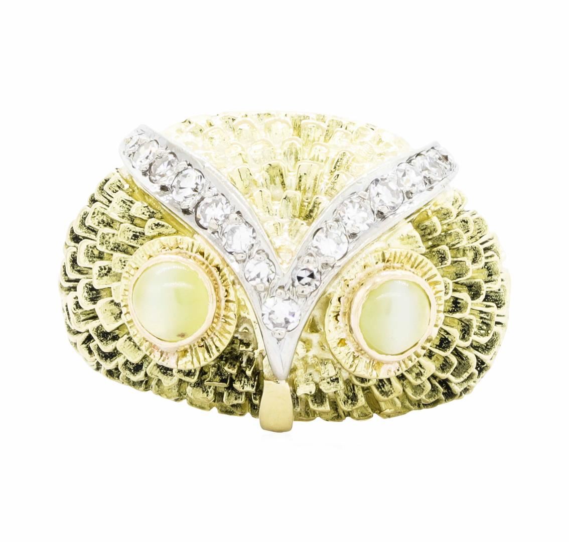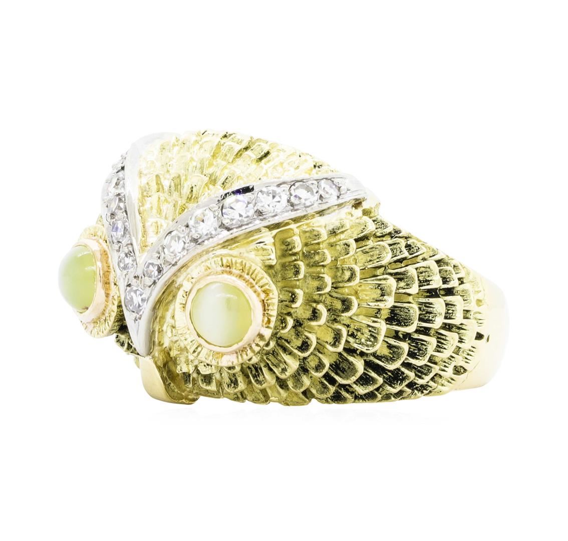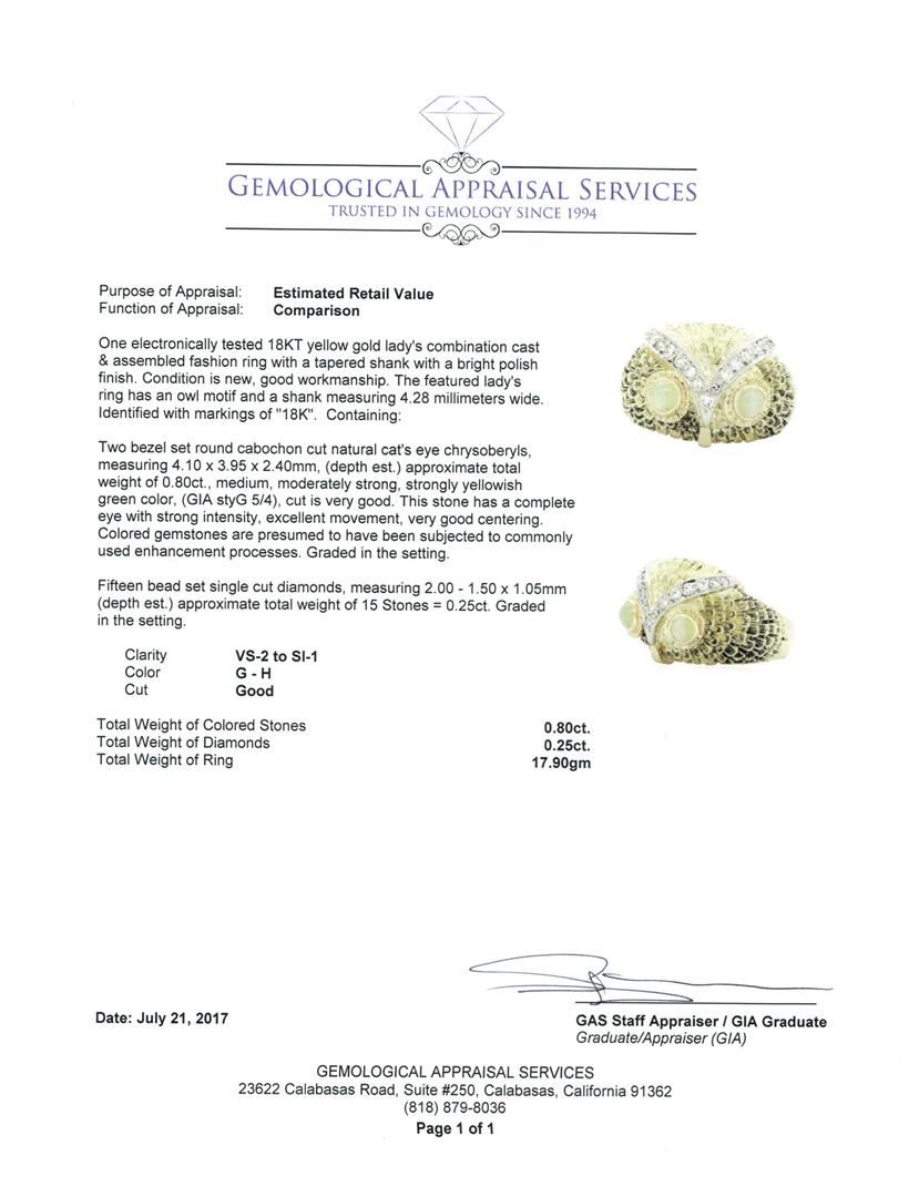 One electronically tested 18KT yellow gold Ladies combination cast & assembled fashion ring with a tapered shank with a bright polish finish. The featured Ladies ring has an owl motif and a shank measuring 4.28 millimeters wide. Identified with markings of '18K'. Condition is new, good workmanship. Containing: Two bezel set round cabochon cut natural cat's eye chrysoberyls, measuring 4.10 x 3.95 x 2.40mm, (depth est.) approximate total weight of 0.80ct., medium, moderately strong, strongly yellowish green color, (GIA styG 5/4), cut is very good. This stone has a complete eye with strong intensity, excellent movement, very good centering. Colored gemstones are presumed to have been subjected to commonly used enhancement processes. Graded in the setting. Fifteen bead set single cut diamonds, measuring 2.00 - 1.50 x 1.05mm (depth est.) approximate total weight of 15 Stones = 0.25ct. Graded in the setting. Color G - H Clarity VS-2 to SI-1 Cut Good. Total Weight of Colored Stones 0.80ct. Total Weight of Diamonds 0.25ct. Total Weight of Ring 17.90gm. GAS Appraised.