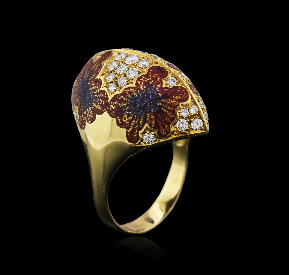 One electronically tested 18KT yellow gold ladies cast diamond ring with a enameled finish. Condition is new. Identified with markings of "18K". Containing: Fifty prong set round brilliant cut diamonds, measuring 2.30 - 1.60 x 1.17mm (depth est.) approximate total weight of 50 Stones = 0.80ct. Clarity of VS-2, color of F, cut is very good. Diamonds are graded in the mounting, unless otherwise stated. Total Weight of Diamonds 0.80ct. Total Weight of Ring 12.60 grams. GGL Appraised at $4,120.00.