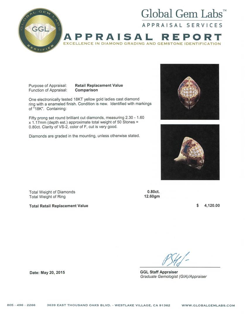 One electronically tested 18KT yellow gold ladies cast diamond ring with a enameled finish. Condition is new. Identified with markings of "18K". Containing: Fifty prong set round brilliant cut diamonds, measuring 2.30 - 1.60 x 1.17mm (depth est.) approximate total weight of 50 Stones = 0.80ct. Clarity of VS-2, color of F, cut is very good. Diamonds are graded in the mounting, unless otherwise stated. Total Weight of Diamonds 0.80ct. Total Weight of Ring 12.60 grams. GGL Appraised at $4,120.00.