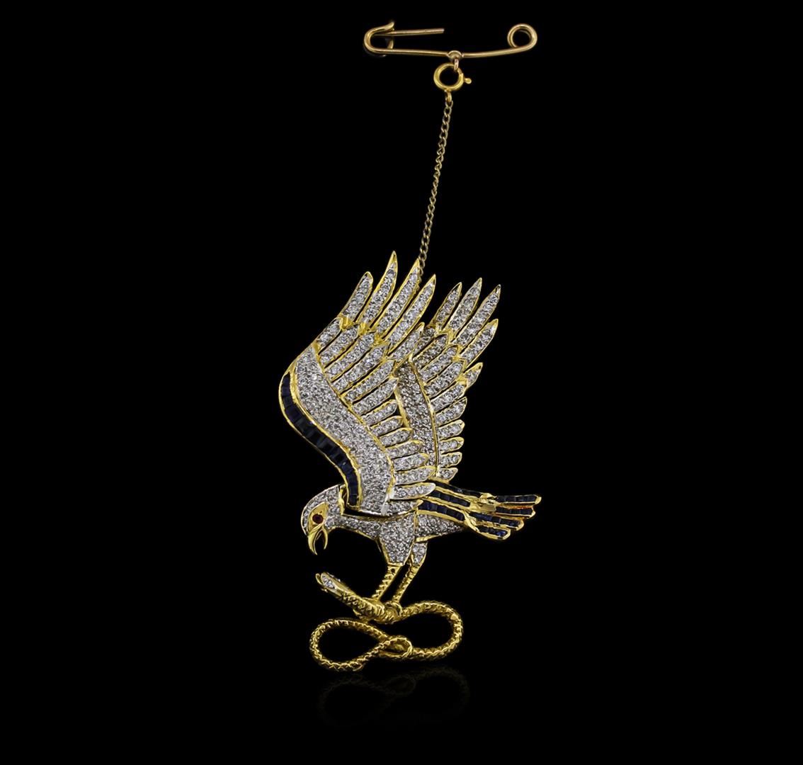 One electronically tested 18KT yellow gold ladies cast sapphire, ruby and diamond Eagle brooch with a bright polish finish. Identified with markings of "750". Condition is very good. Containing: One bezel set round modified brilliant cut natural ruby, measuring 1.50 - 1.50 x 0.98 mm, approximate weight of 0.02ct., clarity is slightly included, medium, moderately strong, strongly purplish red color, (GIA stpR 5/4), cut is good. Forty-four channel set square standard step cut natural blue sapphires, measuring 3.00 x 1.50 x 1.46mm, approximate total weight of 1.00ct., clarity is eye clean, type II, medium, moderately strong, blue color, (GIA B 5/4), cut is good. Two Hundred Eight prong set round brilliant cut diamonds, measuring 1.50 - 1.20 x 0.81mm (depth est.) approximate total weight of 208 Stones = 1.87ct. Clarity: SI-1 to I-1. Color: I - J, Cut is Good. All diamonds and colored gemstones are graded in the mounting, unless otherwise stated. Colored gemstones are presumed to have been subjected to commonly used enhancement processes. Total Weight of Colored Stones 1.02ct. Total Weight of Diamonds 1.87ct. Total Weight of Eagle Brooch 17.80 grams. GGL Appraised at $6,930.00.