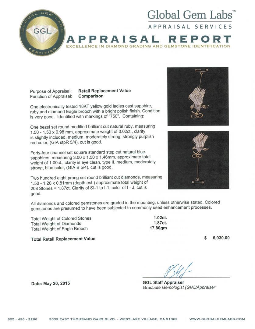 One electronically tested 18KT yellow gold ladies cast sapphire, ruby and diamond Eagle brooch with a bright polish finish. Identified with markings of "750". Condition is very good. Containing: One bezel set round modified brilliant cut natural ruby, measuring 1.50 - 1.50 x 0.98 mm, approximate weight of 0.02ct., clarity is slightly included, medium, moderately strong, strongly purplish red color, (GIA stpR 5/4), cut is good. Forty-four channel set square standard step cut natural blue sapphires, measuring 3.00 x 1.50 x 1.46mm, approximate total weight of 1.00ct., clarity is eye clean, type II, medium, moderately strong, blue color, (GIA B 5/4), cut is good. Two Hundred Eight prong set round brilliant cut diamonds, measuring 1.50 - 1.20 x 0.81mm (depth est.) approximate total weight of 208 Stones = 1.87ct. Clarity: SI-1 to I-1. Color: I - J, Cut is Good. All diamonds and colored gemstones are graded in the mounting, unless otherwise stated. Colored gemstones are presumed to have been subjected to commonly used enhancement processes. Total Weight of Colored Stones 1.02ct. Total Weight of Diamonds 1.87ct. Total Weight of Eagle Brooch 17.80 grams. GGL Appraised at $6,930.00.