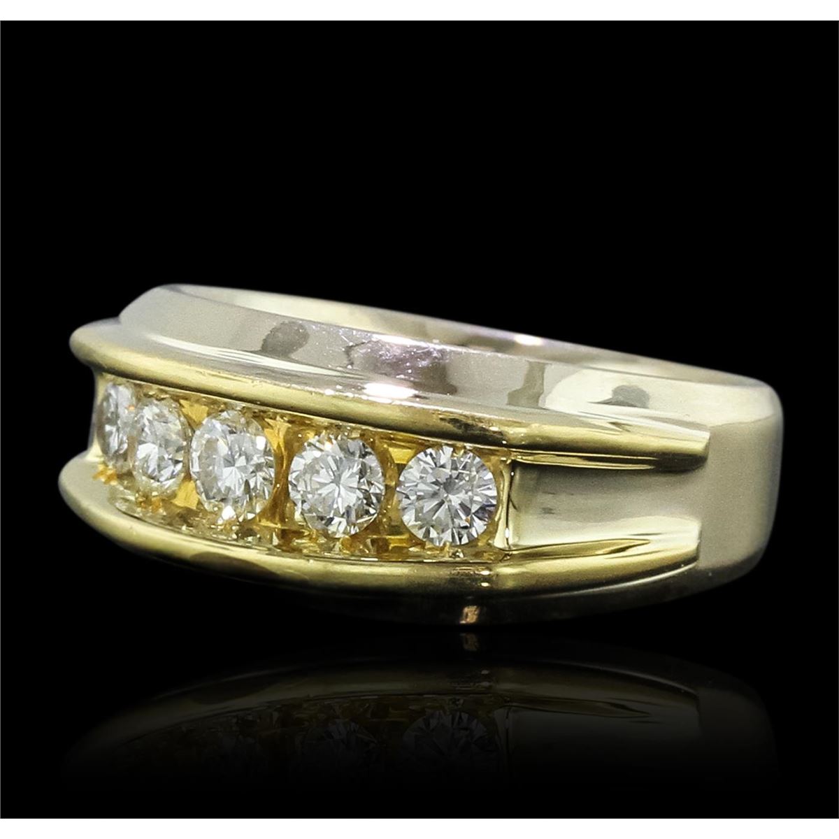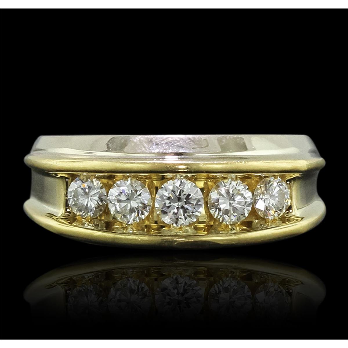 One electronically tested 18KT yellow gold cast diamond ring with a bright polish finish. Condition is new, good workmanship. The ring features a five diamond curvature supported by tapering shoulders, completed by a five millimeter wide band. Identified with markings of "18K". Containing: Five bead set round brilliant cut diamonds, measuring 3.90 - 3.70 x 2.28mm (depth est.) approximate. Total Weight of 5 Stones = 1.10ct. Graded in the setting. Clarity: SI-1 to SI-2. Color: F - G. Total Weight of Diamonds 1.10ct. Total Weight of Ring 13.00 grams. AIG Appraised at $8,290.00.