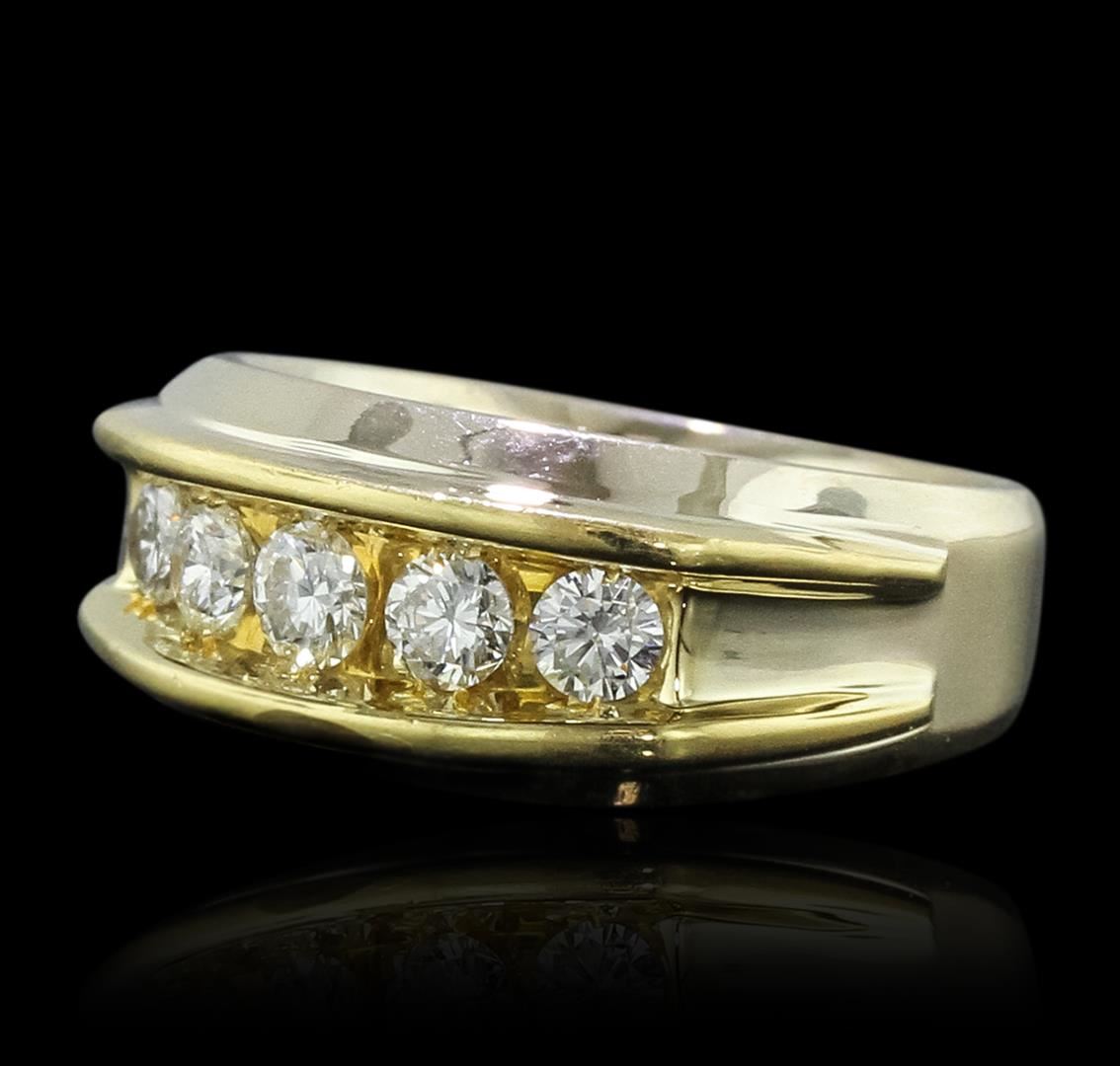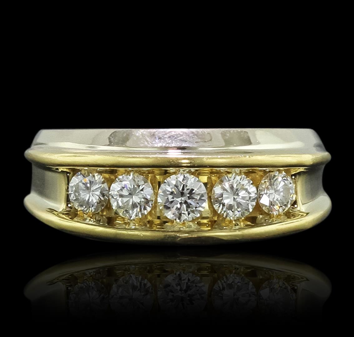 One electronically tested 18KT yellow gold cast diamond ring with a bright polish finish. Condition is new, good workmanship. The ring features a five diamond curvature supported by tapering shoulders, completed by a five millimeter wide band. Identified with markings of "18K". Containing: Five bead set round brilliant cut diamonds, measuring 3.90 - 3.70 x 2.28mm (depth est.) approximate. Total Weight of 5 Stones = 1.10ct. Graded in the setting. Clarity: SI-1 to SI-2. Color: F - G. Total Weight of Diamonds 1.10ct. Total Weight of Ring 13.00 grams. AIG Appraised at $8,290.00.