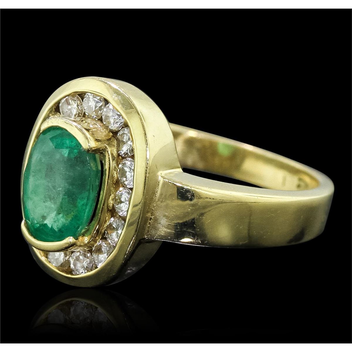 One electronically tested 18KT yellow gold ladies cast emerald and diamond ring with a bright polish finish. Condition is good. The featured emerald is set within a diamond bezel, completed by a two and one-half millimeter wide band. Identified with markings of "18K". Containing: One bezel set oval mixed cut natural emerald, measuring 7.90 x 6.20 x 4.40mm, approximate weight of 1.19ct., clarity is heavily included, type III, medium dark, moderately strong, very slightly bluish green color, (GIA vslbG 6/4), cut is good. Transmitting light with a minimum of distortion, transparent to translucent. Naturally occurring internal & external characteristics are present. Indications of oil residue. Graded in the setting. Fifteen channel set round brilliant cut diamonds, measuring 2.10 - 2.00 x 1.23mm (depth est.) approximate. Total Weight of 15 Stones = 0.57ct. Graded in the setting. Clarity: VS-1 to SI-1. Color: F - H. Total Weight of Colored Stones 1.19ct. Total Weight of Diamonds 0.57ct. Total Weight of Ring 5.30 grams. AIG Appraised at $5,250.00.