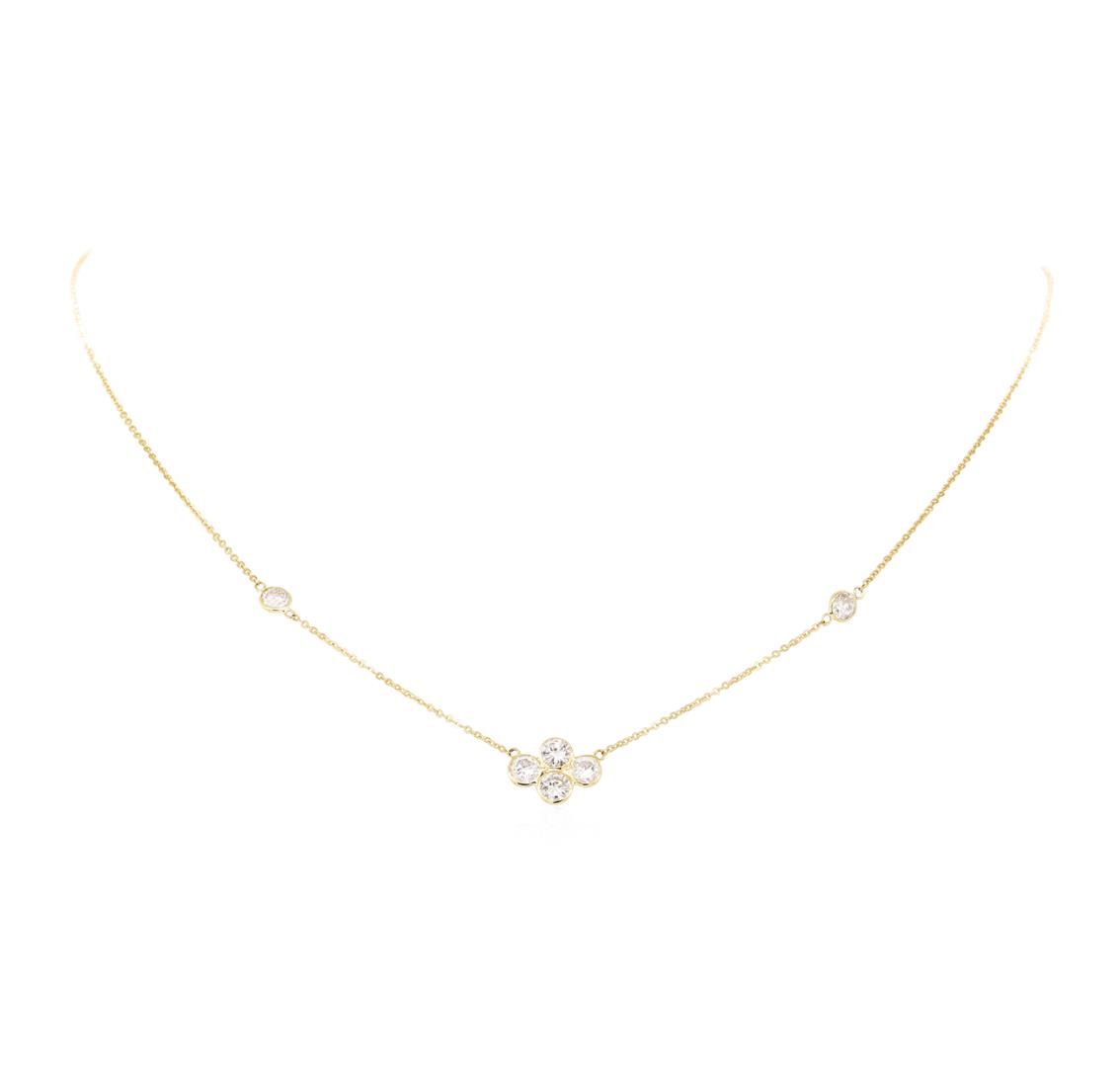 One electronically tested 18KT yellow gold lady's hand fabricated fashion necklace with a spring ring clasp with a bright polish finish. The featured lady's necklace has an attached 1mm diamond cut oval cable link chain measuring approximately sixteen inches long. Identified with markings of '18K'. Condition is new, good workmanship. Containing: Six bezel set round brilliant cut diamonds, measuring 3.85 - 3.75 x 2.36mm (depth est.) approximate total weight of 6 Stones = 1.25ct. Graded in the setting. Color H - I, Clarity SI-2 to I-1, Cut Good. Total Weight of Diamonds 1.25ct. Total Weight of Necklace 1.70gm. GAS Appraised.