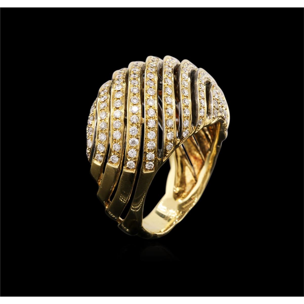 One electronically tested 18KT yellow gold ladies cast diamond ring with a bright polish finish. Identified with markings of "18K". Condition is new. Containing: One Hundred Sixty-Three prong set round brilliant cut diamonds, measuring 1.10 - 1.10 x 0.66mm (depth est.) approximate total weight of 163 Stones = 1.25ct. Clarity: SI-1 to SI-2. Color: H - I. All diamonds are graded in the mounting, unless otherwise stated. Total Weight of Diamonds 1.25ct. Total Weight of Ring 11.40 grams. GGL Appraised at $5,830.00.