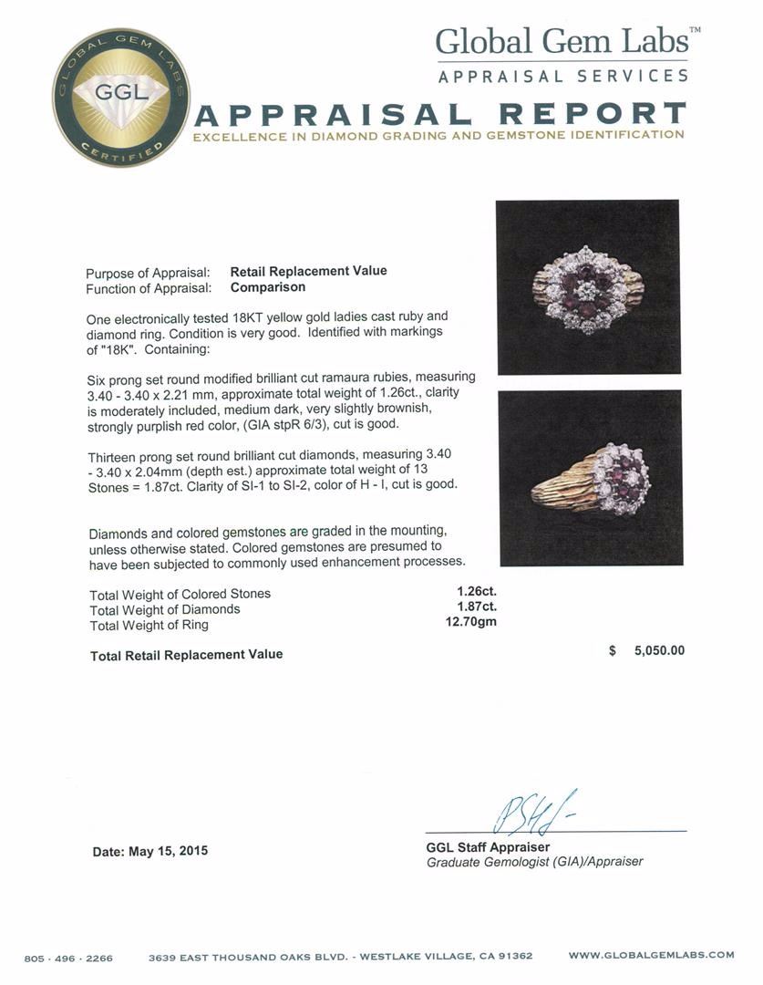 One electronically tested 18KT yellow gold ladies cast ruby and diamond ring. Identified with markings of "18K". Condition is very good. Containing: Six prong set round modified brilliant cut ramaura rubies, measuring 3.40 - 3.40 x 2.21 mm, approximate total weight of 1.26ct., clarity is moderately included, medium dark, very slightly brownish, strongly purplish red color, (GIA stpR 6/3), cut is good. Thirteen prong set round brilliant cut diamonds, measuring 3.40 - 3.40 x 2.04mm (depth est.) approximate total weight of 13 Stones = 1.87ct. Clarity: SI-1 to SI-2. Color: H - I, Cut is Good. Diamonds and colored gemstones are graded in the mounting, unless otherwise stated. Colored gemstones are presumed to have been subjected to commonly used enhancement processes. Total Weight of Colored Stones 1.26ct. Total Weight of Diamonds 1.87ct. Total Weight of Ring 12.70 grams. GGL Appraised at $5,050.00.