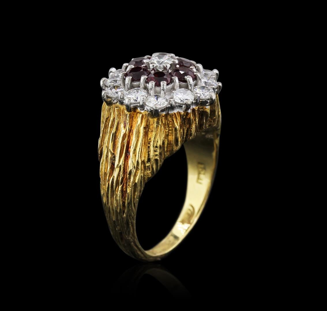 One electronically tested 18KT yellow gold ladies cast ruby and diamond ring. Identified with markings of "18K". Condition is very good. Containing: Six prong set round modified brilliant cut ramaura rubies, measuring 3.40 - 3.40 x 2.21 mm, approximate total weight of 1.26ct., clarity is moderately included, medium dark, very slightly brownish, strongly purplish red color, (GIA stpR 6/3), cut is good. Thirteen prong set round brilliant cut diamonds, measuring 3.40 - 3.40 x 2.04mm (depth est.) approximate total weight of 13 Stones = 1.87ct. Clarity: SI-1 to SI-2. Color: H - I, Cut is Good. Diamonds and colored gemstones are graded in the mounting, unless otherwise stated. Colored gemstones are presumed to have been subjected to commonly used enhancement processes. Total Weight of Colored Stones 1.26ct. Total Weight of Diamonds 1.87ct. Total Weight of Ring 12.70 grams. GGL Appraised at $5,050.00.