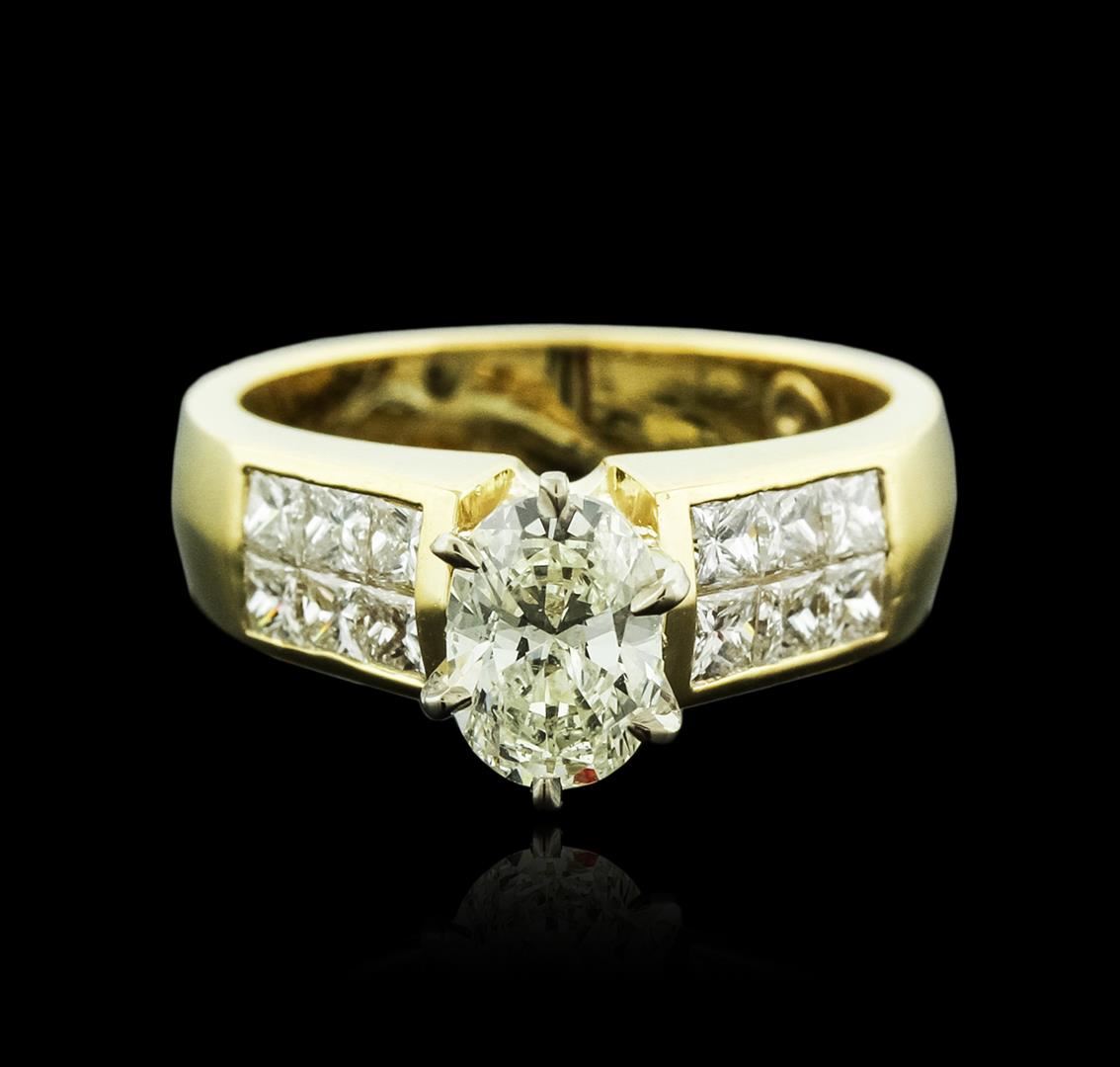 One electronically tested 18KT yellow gold ladies cast diamond engagement ring with a half round shank with a bright polish finish. Identified with markings of "18K". Condition is new. Containing: One prong set oval shaped cut diamond, measuring 6.43 x 5.24 x 3.30mm (depth est.) approximate weight of 0.70ct. Clarity: SI-2. Color: L, Cut is Good. Twelve invisible set princess cut diamonds, measuring 2.00 x 2.00 x 1.50mm (depth est.) approximate total weight of 12 Stones = 0.59ct. Clarity: VS-2 to SI-1. Color: H - I, Cut is Good. All diamonds are graded in the mounting, unless otherwise stated. Total Weight of Diamonds 1.29ct. Total Weight of Engagement Ring 8.30 grams. GGL Appraised at $6,395.00.