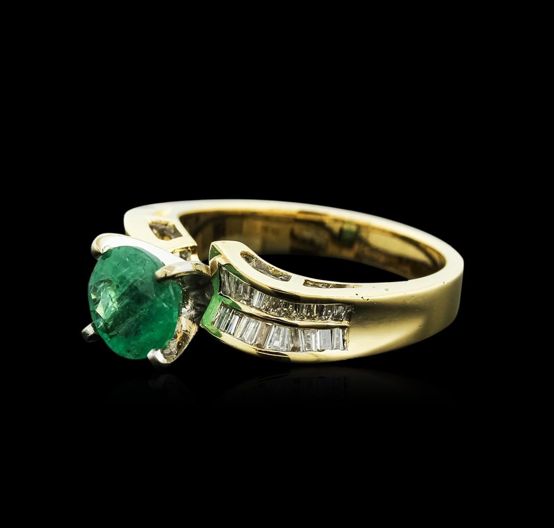 One electronically tested 18KT yellow gold ladies cast emerald and diamond ring with a bright and brushed finish. Identified with markings of "18K". Condition is new. Containing: One prong set round modified brilliant cut natural emerald, measuring 7.20 - 7.20 x 4.69 mm, approximate weight of 1.32ct., clarity is heavily included, type III, medium, moderately strong, green color, (GIA G 5/4), cut is good. Thirty-Six channel set baguette cut diamonds, measuring 1.50 x 1.30 x 1.11mm (depth est.) approximate total weight of 36 Stones = 0.71ct. Clarity: I-1 to I-2. Color: I - J. Colored gemstones are presumed to have been subjected to commonly used enhancement processes. All diamonds and colored gemstones are graded in the mounting, unless otherwise stated. Total Weight of Colored Stones 1.32ct. Total Weight of Diamonds 0.71ct. Total Weight of Ring 6.40 grams. GGL Appraised at $4,265.00.