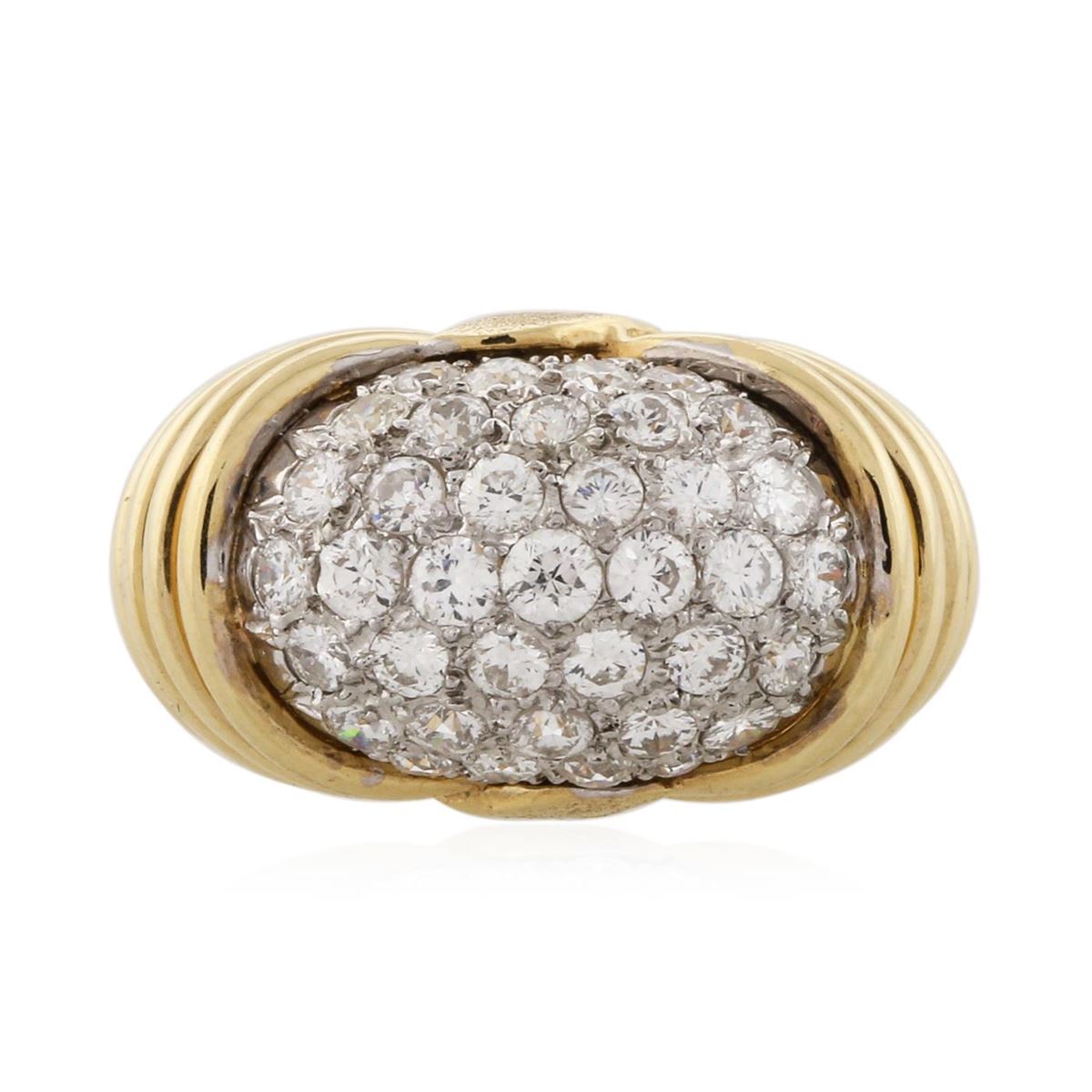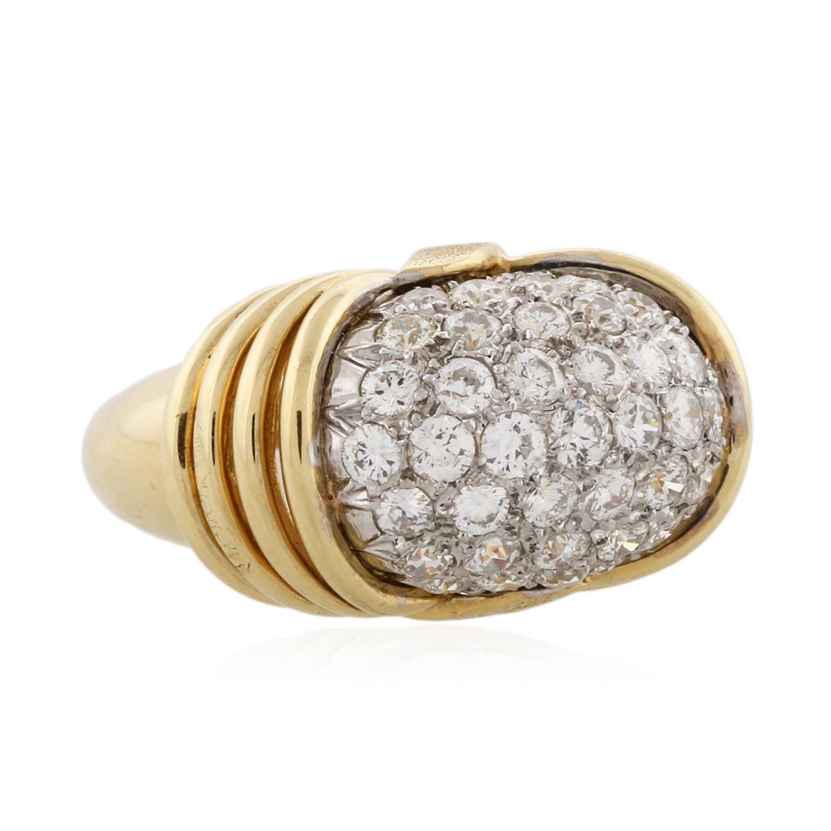 One electronically tested 18KT yellow gold ladies cast diamond ring with a bright polish finish. Condition is new. Containing: Thirty-Seven pave' set round brilliant cut diamonds, measuring 2.50 - 1.80 x 1.29mm (depth est.) approximate total weight of 37 Stones = 1.34ct. Clarity: SI-1 to SI-2. Color: H - I. All diamonds are graded in the mounting, unless otherwise stated. Total Weight of Diamonds 1.34ct. Total Weight of Ring 10.30 grams. GGL Appraised at $6,345.00.