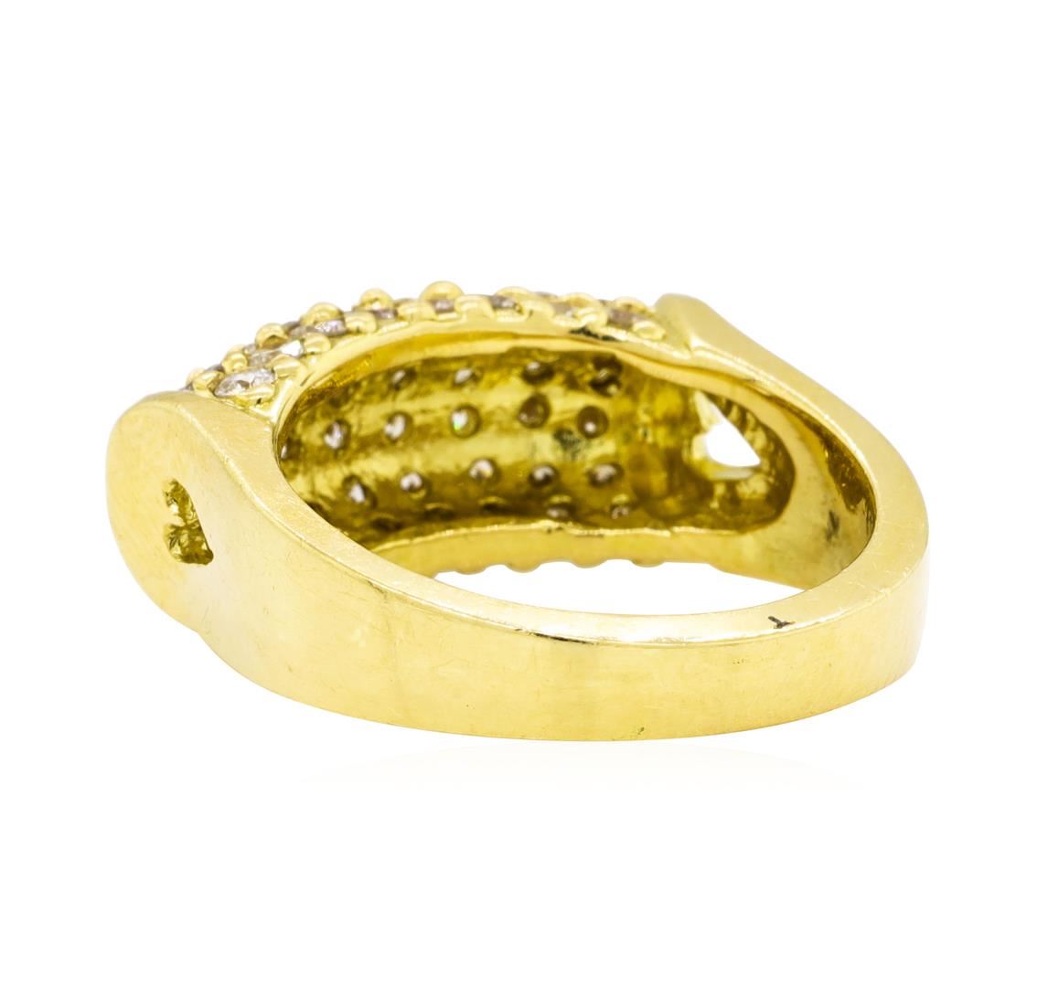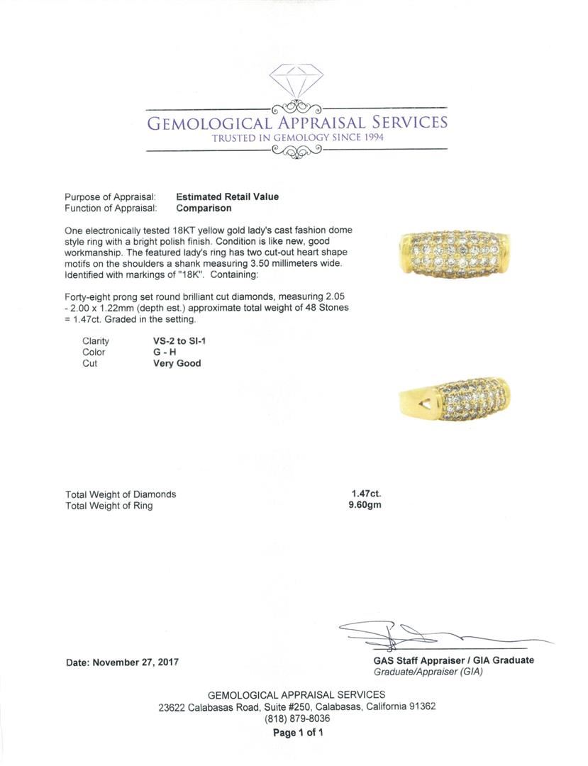 One electronically tested 18KT yellow gold lady's cast fashion dome style ring with a bright polish finish. The featured lady's ring has two cut-out heart shape motifs on the shoulders a shank measuring 3.50 millimeters wide. Identified with markings of '18K'. Condition is like new, good workmanship. Containing: Forty-Eight prong set round brilliant cut diamonds, measuring 2.05 - 2.00 x 1.22mm (depth est.) approximate total weight of 48 Stones = 1.47ct. Graded in the setting. Color G - H Clarity VS-2 to SI-1 Cut Very Good. Total Weight of Diamonds 1.47ct.. Total Weight of Ring 9.60gm. GAS Appraised.