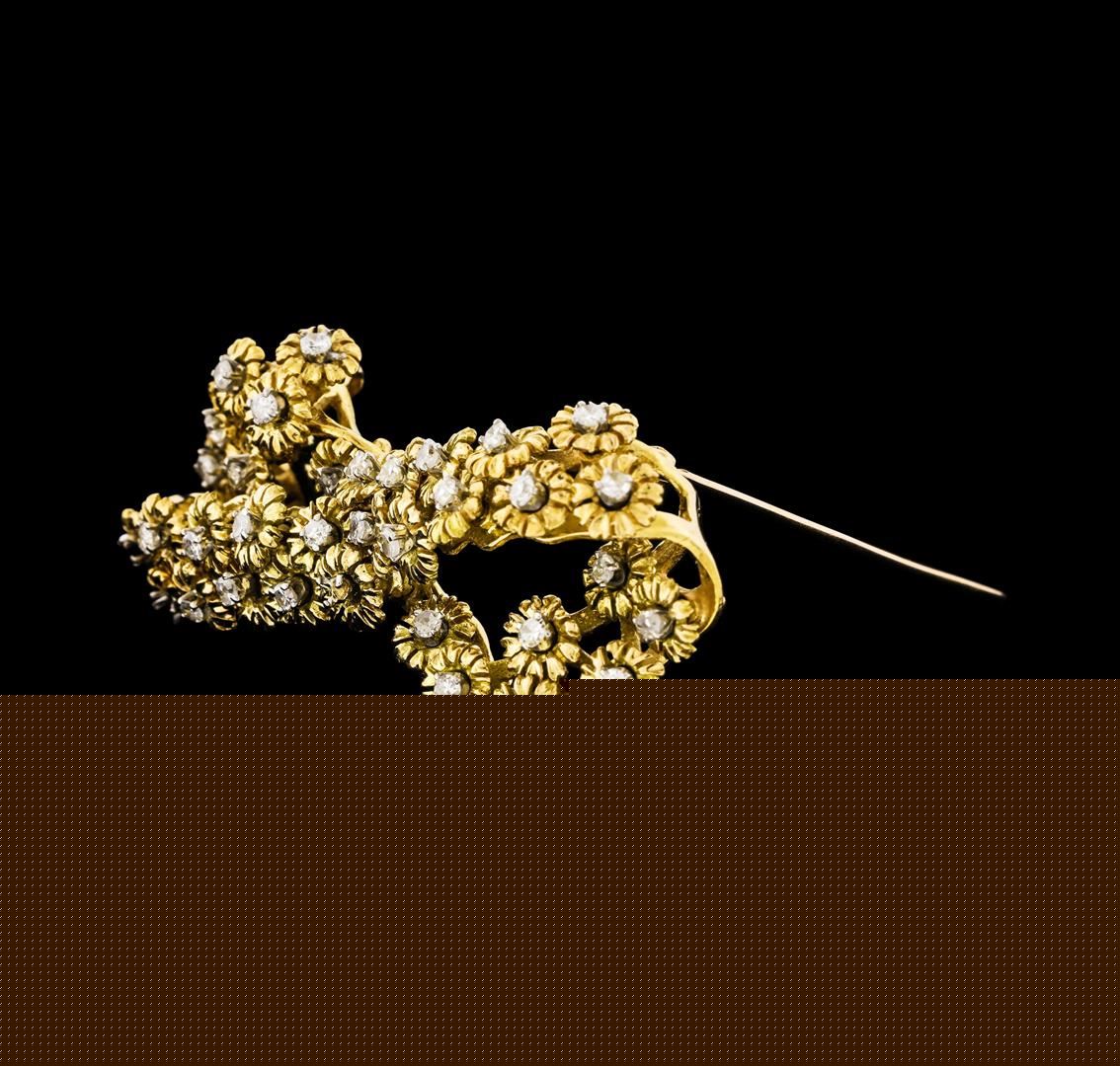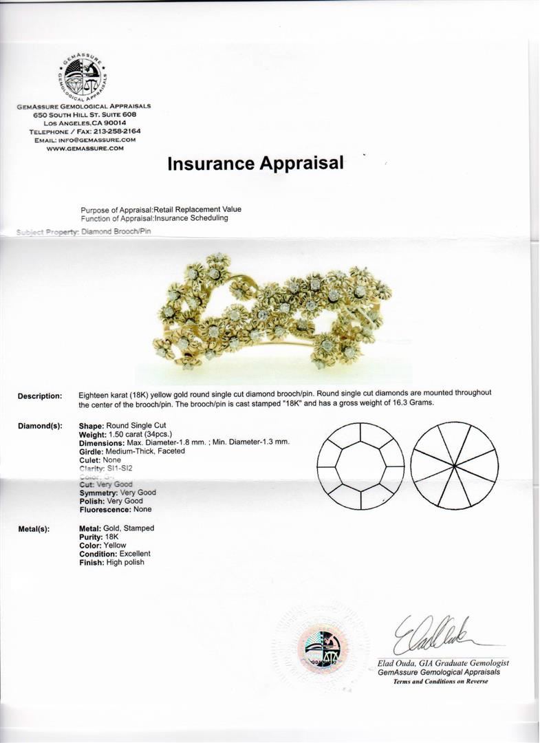 One 18KT Yellow Gold 1.50ctw Diamond Brooch with a total weight of 16.3 grams. (34) diamonds with a total weight of 1.50cts with a color of (G-I) and clarity of (SI-1 to SI-2). GGA Appraised.