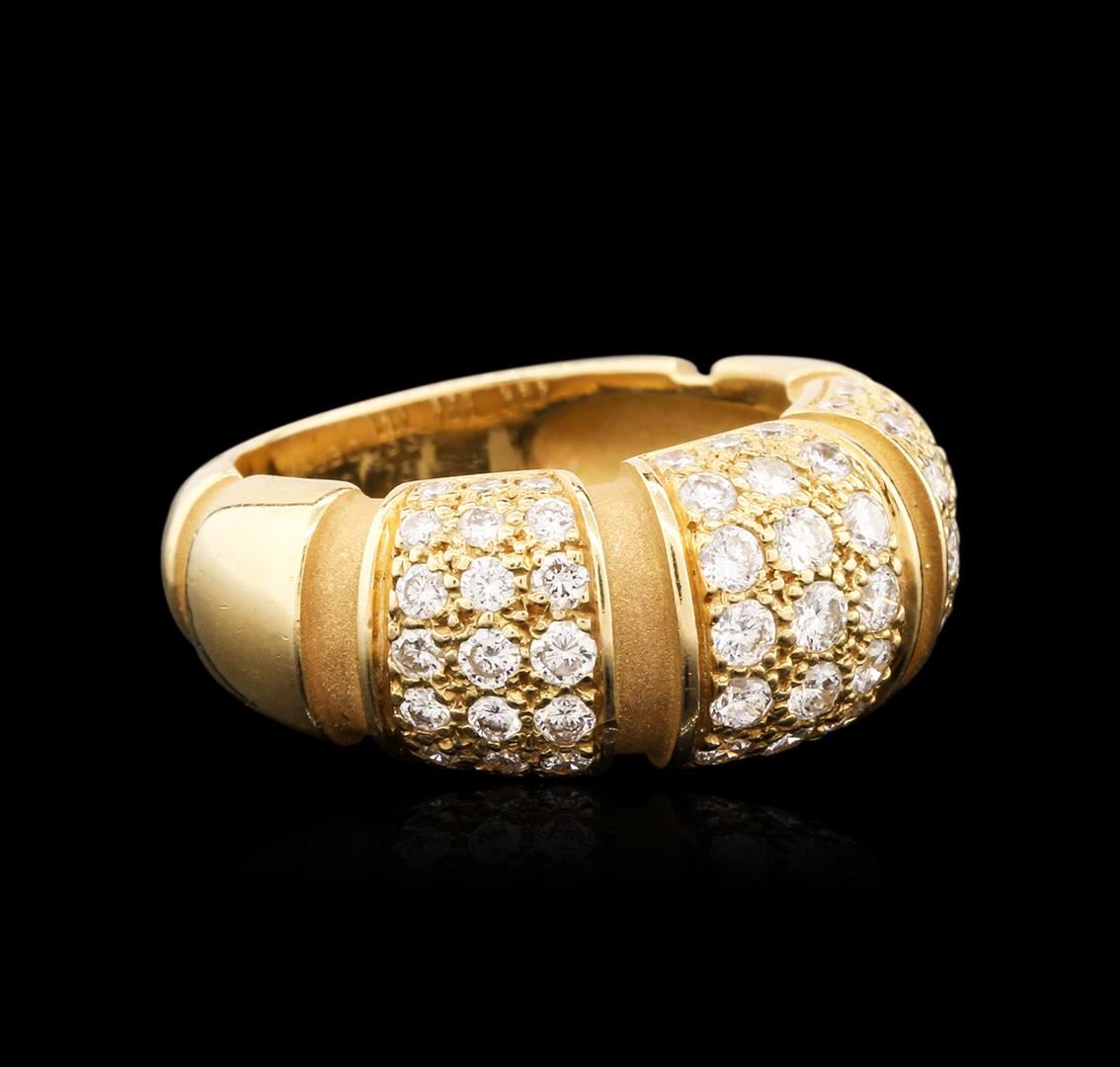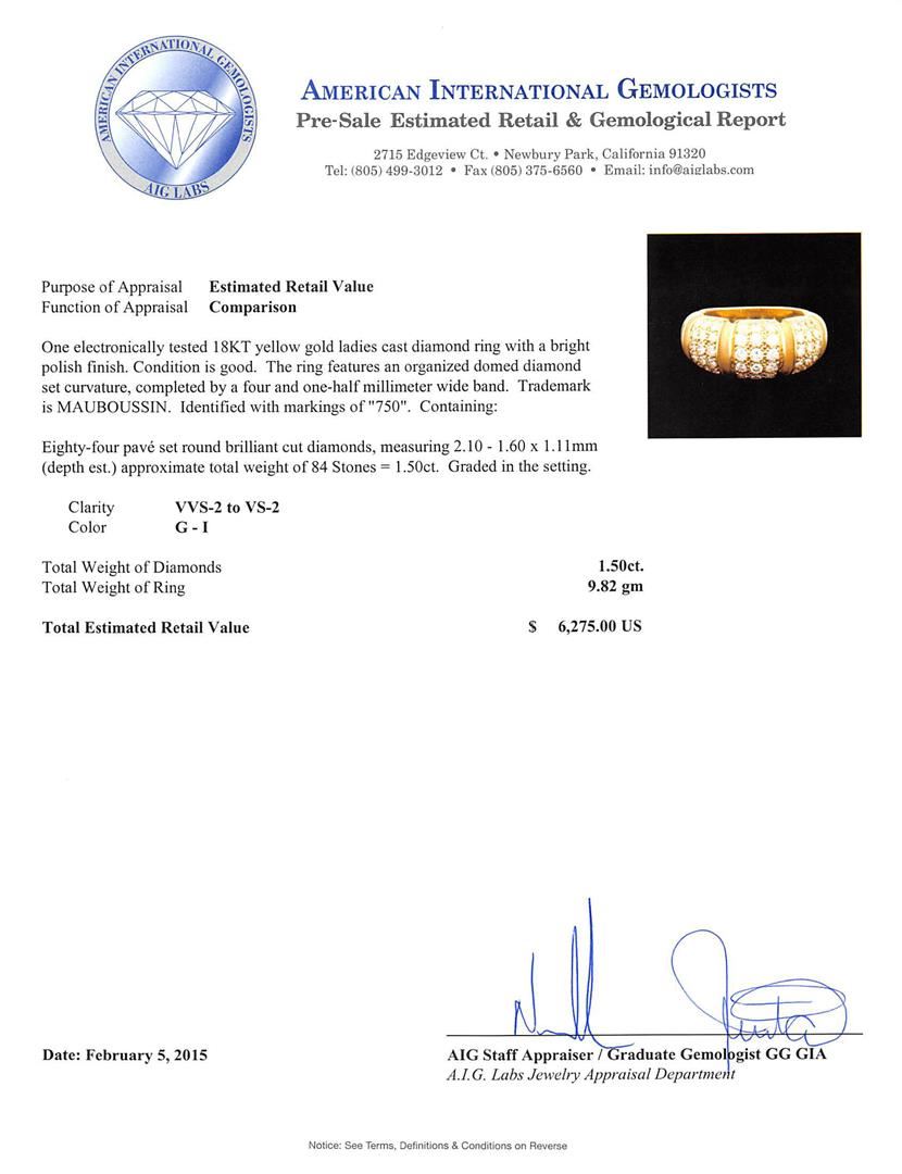 One electronically tested 18KT yellow gold ladies cast diamond ring with a bright polish finish. The ring features an organized domed diamond set curvature, completed by a four and one-half millimeter wide band. Trademark is MAUBOUSSIN. Identified with markings of "750". Condition is good. Containing: Eighty-Four pave set round brilliant cut diamonds, measuring 2.10 - 1.60 x 1.11mm (depth est.) approximate total weight of 84 Stones = 1.50ct. Graded in the setting. Clarity: VVS-2 to VS-2. Color: G - I. Total Weight of Diamonds 1.50ct. Total Weight of Ring 9.82 grams. AIG Appraised at $6,275.00.