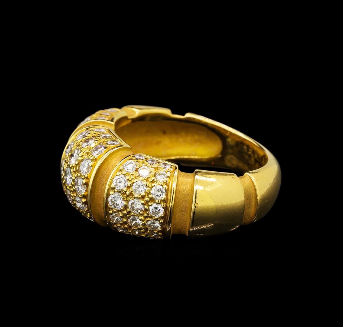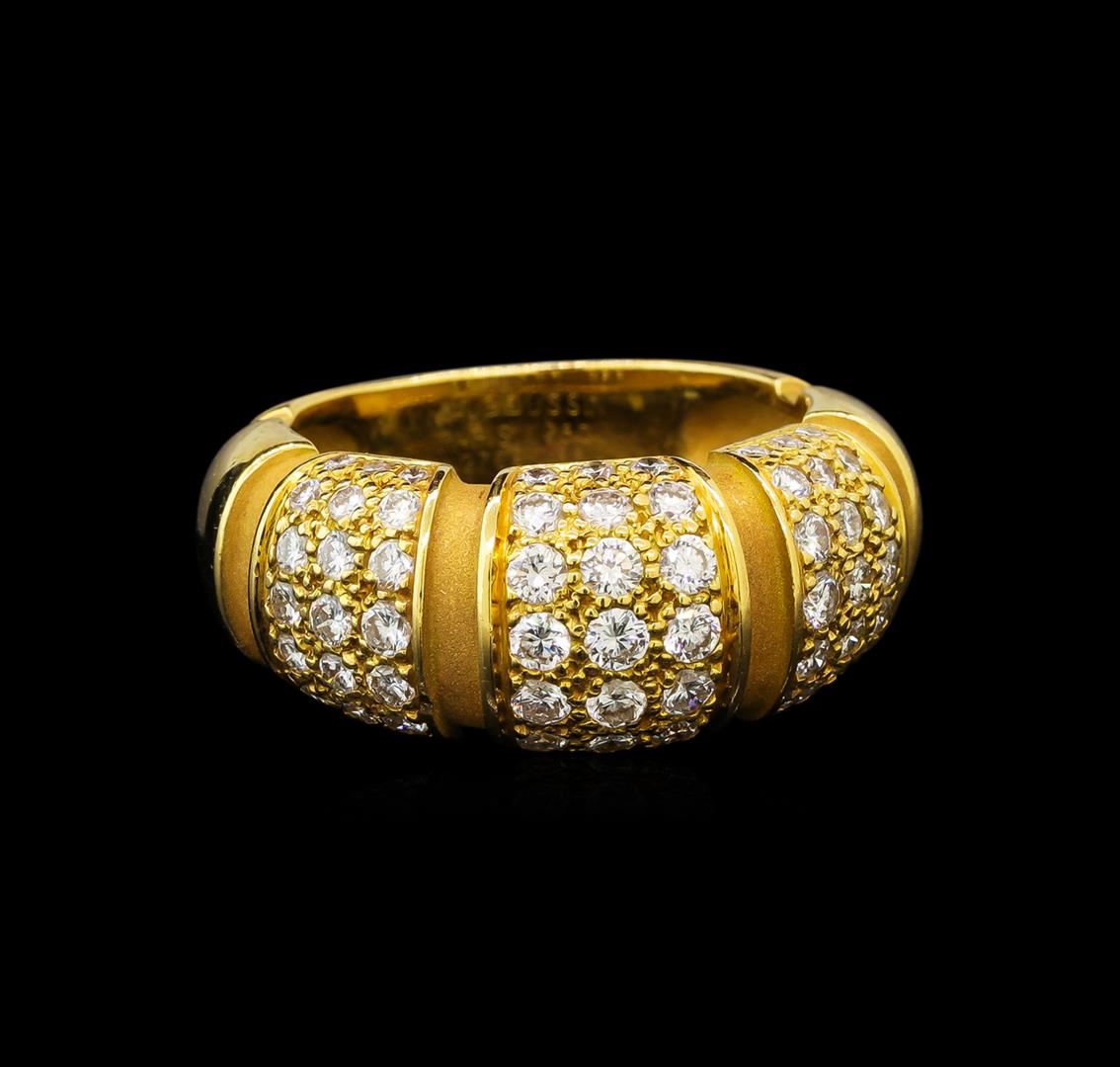 One electronically tested 18KT yellow gold ladies cast diamond ring with a bright polish finish. The ring features an organized domed diamond set curvature, completed by a four and one-half millimeter wide band. Trademark is MAUBOUSSIN. Identified with markings of "750". Condition is good. Containing: Eighty-Four pave set round brilliant cut diamonds, measuring 2.10 - 1.60 x 1.11mm (depth est.) approximate total weight of 84 Stones = 1.50ct. Graded in the setting. Clarity: VVS-2 to VS-2. Color: G - I. Total Weight of Diamonds 1.50ct. Total Weight of Ring 9.82 grams. AIG Appraised at $6,275.00.