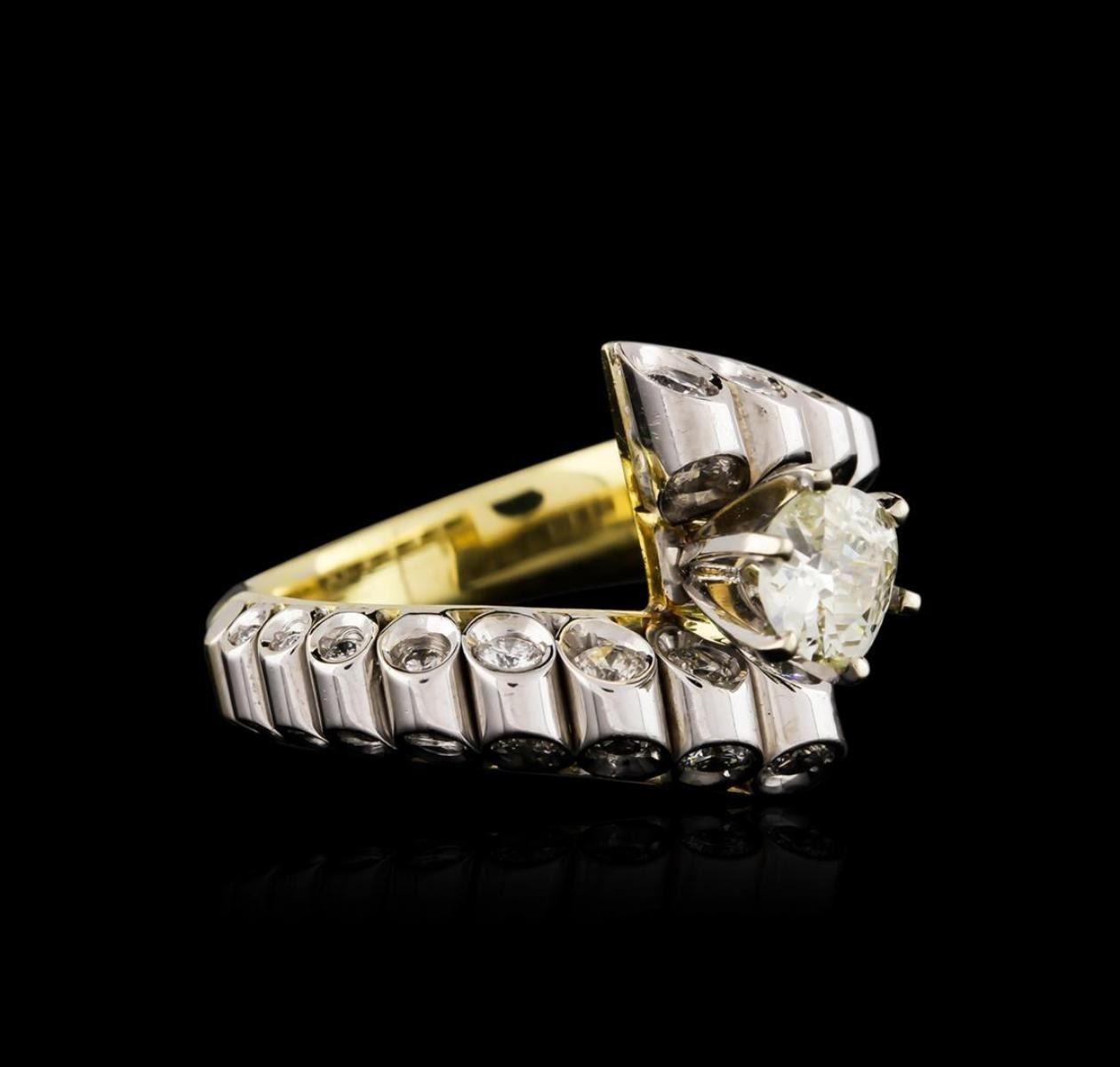 One electronically tested 18KT yellow gold ladies cast diamond engagement ring with a bright polish finish. Identified with markings of "18K". Condition is new. Containing: One prong set round brilliant cut diamond, measuring 5.80 - 5.80 x 3.48mm (depth est.) approximate weight of 0.71ct. Clarity: SI-1. Color: L. Twenty-Eight prong set round brilliant cut diamonds, measuring 2.50 - 1.50 x 1.20mm (depth est.) approximate total weight of 28 Stones = 0.82ct. Clarity: SI-1 to I-1. Color: I - J. All diamonds are graded in the mounting, unless otherwise stated. Total Weight of Diamonds 1.53ct. Total Weight of Engagement Ring 8.90 grams. GGL Appraised.