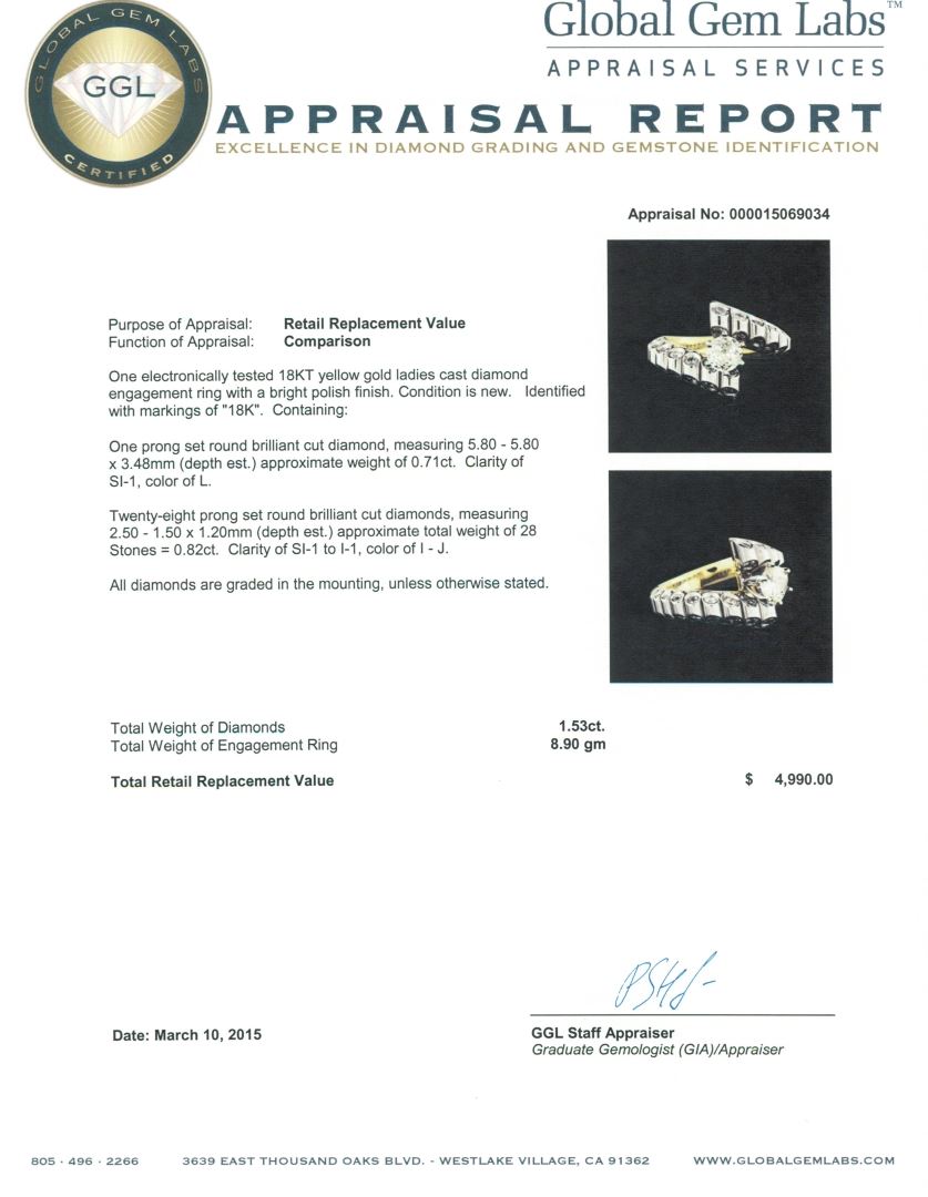 One electronically tested 18KT yellow gold ladies cast diamond engagement ring with a bright polish finish. Identified with markings of "18K". Condition is new. Containing: One prong set round brilliant cut diamond, measuring 5.80 - 5.80 x 3.48mm (depth est.) approximate weight of 0.71ct. Clarity: SI-1. Color: L. Twenty-Eight prong set round brilliant cut diamonds, measuring 2.50 - 1.50 x 1.20mm (depth est.) approximate total weight of 28 Stones = 0.82ct. Clarity: SI-1 to I-1. Color: I - J. All diamonds are graded in the mounting, unless otherwise stated. Total Weight of Diamonds 1.53ct. Total Weight of Engagement Ring 8.90 grams. GGL Appraised at $4,990.00.
