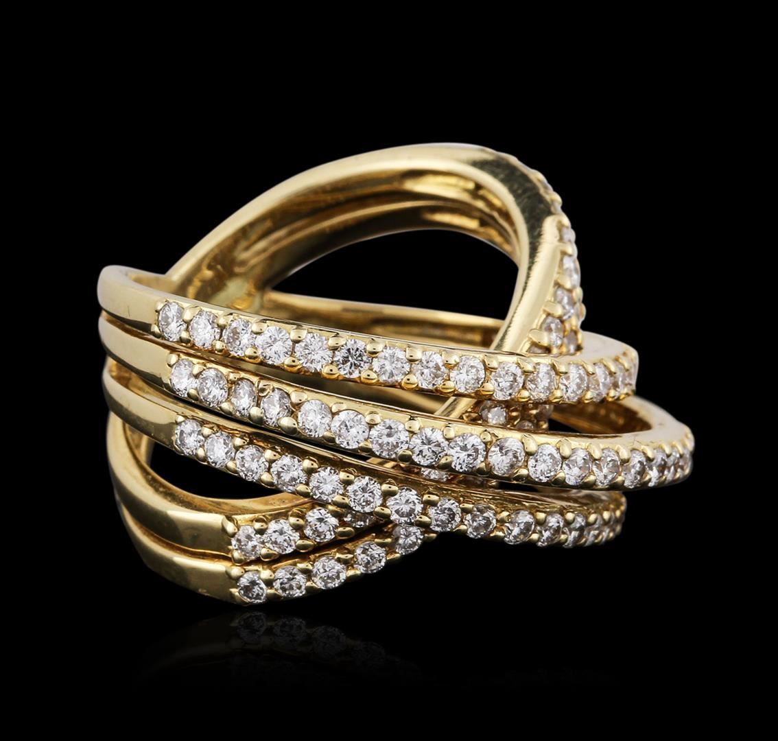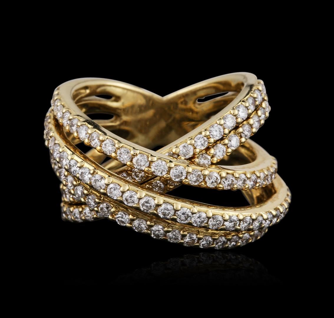 One electronically tested 18KT yellow gold ladies cast diamond ring with a bright polish finish. Trademark is Sonia B. Identified with markings of "18K". Condition is new. Containing: One Hundred Nine prong set round brilliant cut diamonds, measuring 1.60 - 1.60 x 0.96mm (depth est.) approximate total weight of 109 Stones = 1.62ct. Clarity: SI-1 to SI-2. Color: H - I, Cut is Good. All diamonds are graded in the mounting, unless otherwise stated. Total Weight of Diamonds 1.62ct. Total Weight of Ring 14.00. grams. GGL Appraised at $5,765.00.