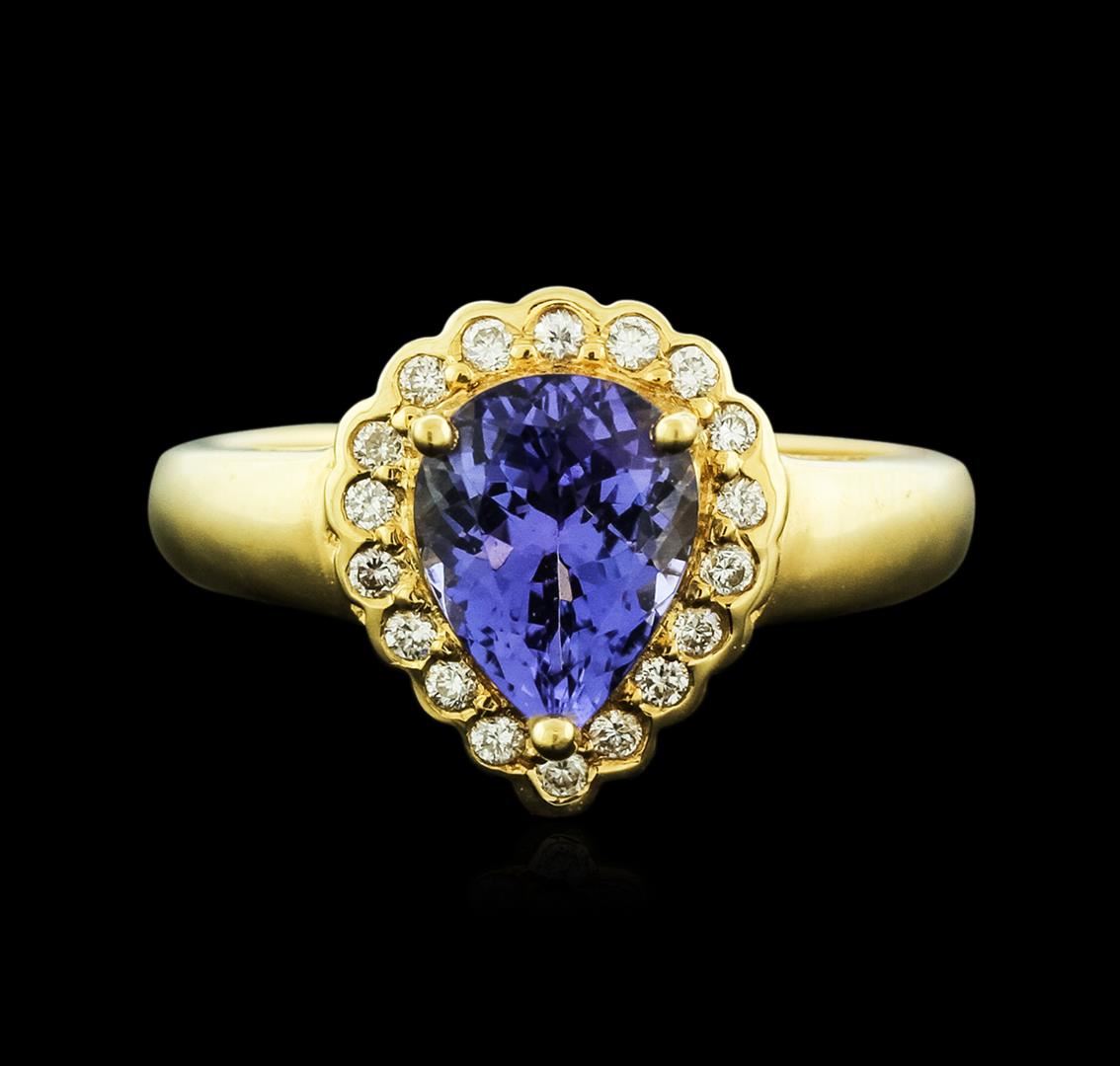 One electronically tested 18KT yellow gold ladies cast tanzanite and diamond ring with a bright polish finish. Identified with markings of "18K". Condition is new. Containing: One prong set pear modified brilliant cut natural tanzanite, measuring 8.70 x 6.70 x 4.36mm, approximate weight of 1.70ct., clarity is eye clean, type I, medium light, very slightly grayish, bluish violet color, (GIA bV 4/3), cut is good. Eighteen prong set round brilliant cut diamonds, measuring 1.20 - 1.20 x 0.72mm (depth est.) approximate total weight of 18 Stones = 0.11ct. Clarity: SI-2 to I-1. Color: I - J. Colored gemstones are presumed to have been subjected to commonly used enhancement processes. All diamonds and colored gemstones are graded in the mounting, unless otherwise stated. Total Weight of Colored Stones 1.70ct. Total Weight of Diamonds 0.11ct. Total Weight of Ring 4.60 grams. GGL Appraised at $2,065.00.