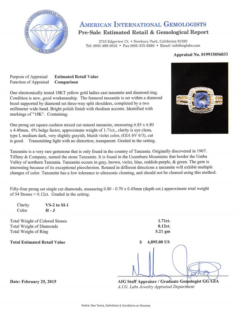 One electronically tested 18KT yellow gold ladies cast tanzanite and diamond ring. The featured tanzanite is set within a diamond bezel supported by diamond set three-way split shoulders, completed by a two millimeter wide band. Bright polish finish with rhodium accents. Identified with markings of "18K". Condition is new, good workmanship. Containing: One prong set square cushion mixed cut natural tanzanite, measuring 6.85 x 6.80 x 4.40mm, 6%. bulge factor, approximate weight of 1.71ct., clarity is eye clean, type I, medium dark, very slightly grayish, bluish violet color, (GIA bV 6/3), cut is good. Transmitting light with no distortion, transparent. Graded in the setting. Tanzanite is a very rare gemstone that is only found in the country of Tanzania. Originally discovered in 1967. Tiffany & Company, named the stone Tanzanite. It is found in the Usumburu Mountains that border the Umba Valley of northern Tanzania. Tanzanite occurs in gray, brown, violet, blue, reddish-purple, & green. The gem is interesting because of its exceptional pleochroism. Rotated in different directions a tanzanite will exhibit multiple changes of color. Tanzanite has a low tolerance to ultrasonic cleaning, and should not be cleaned using this method. Fifty-Four prong set single cut diamonds, measuring 0.80 - 0.70 x 0.45mm (depth est.) approximate total weight of 54 Stones = 0.12ct. Graded in the setting. Clarity: VS-2 to SI-1. Color: H - J. Total Weight of Colored Stones 1.71ct. Total Weight of Diamonds 0.12ct. Total Weight of Ring 5.21 grams. AIG Appraised at $4,895.00.