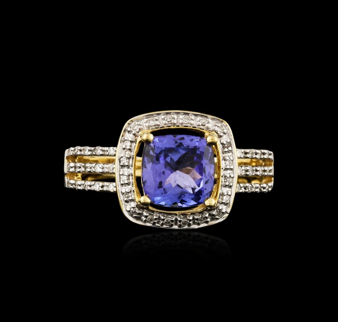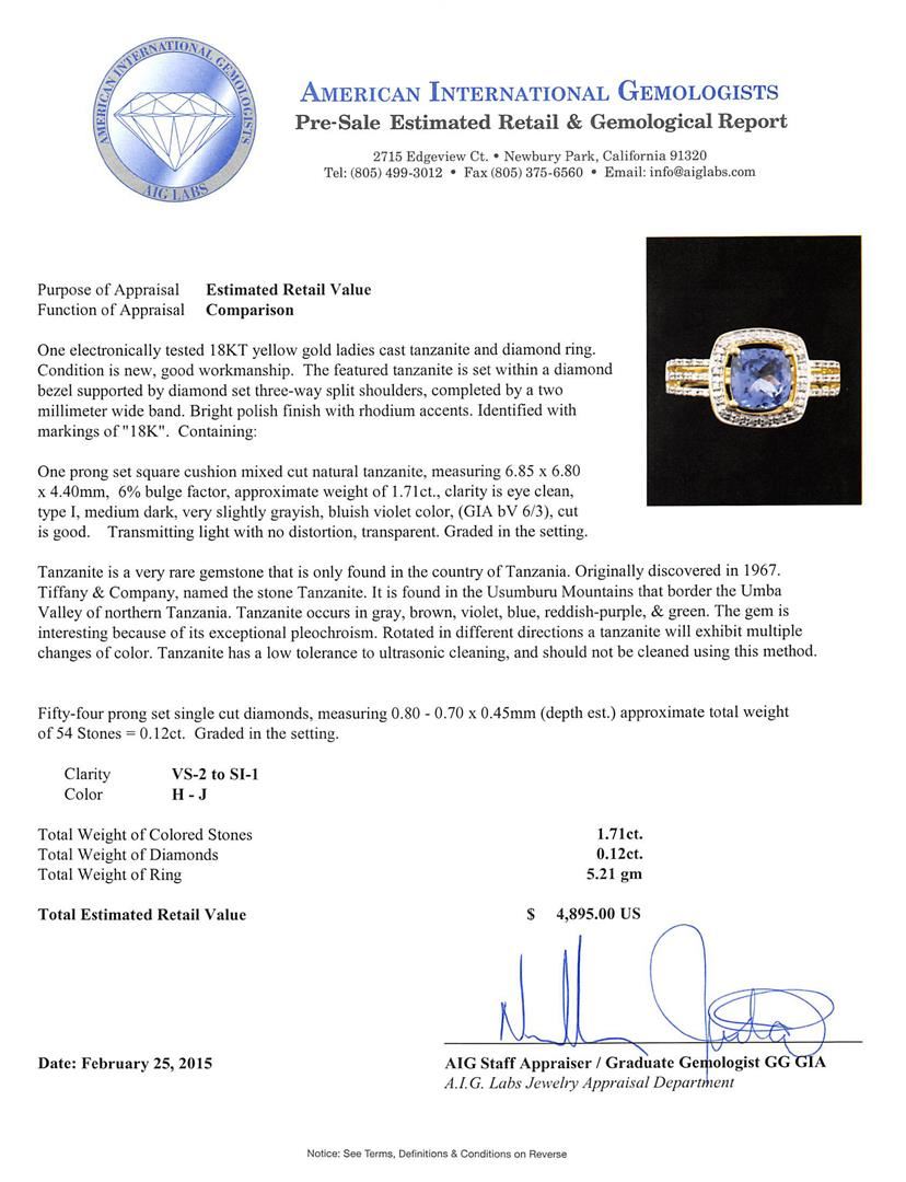 One electronically tested 18KT yellow gold ladies cast tanzanite and diamond ring. The featured tanzanite is set within a diamond bezel supported by diamond set three-way split shoulders, completed by a two millimeter wide band. Bright polish finish with rhodium accents. Identified with markings of "18K". Condition is new, good workmanship. Containing: One prong set square cushion mixed cut natural tanzanite, measuring 6.85 x 6.80 x 4.40mm, 6%. bulge factor, approximate weight of 1.71ct., clarity is eye clean, type I, medium dark, very slightly grayish, bluish violet color, (GIA bV 6/3), cut is good. Transmitting light with no distortion, transparent. Graded in the setting. Tanzanite is a very rare gemstone that is only found in the country of Tanzania. Originally discovered in 1967. Tiffany & Company, named the stone Tanzanite. It is found in the Usumburu Mountains that border the Umba Valley of northern Tanzania. Tanzanite occurs in gray, brown, violet, blue, reddish-purple, & green. The gem is interesting because of its exceptional pleochroism. Rotated in different directions a tanzanite will exhibit multiple changes of color. Tanzanite has a low tolerance to ultrasonic cleaning, and should not be cleaned using this method. Fifty-Four prong set single cut diamonds, measuring 0.80 - 0.70 x 0.45mm (depth est.) approximate total weight of 54 Stones = 0.12ct. Graded in the setting. Clarity: VS-2 to SI-1. Color: H - J. Total Weight of Colored Stones 1.71ct. Total Weight of Diamonds 0.12ct. Total Weight of Ring 5.21 grams. AIG Appraised at $4,895.00.