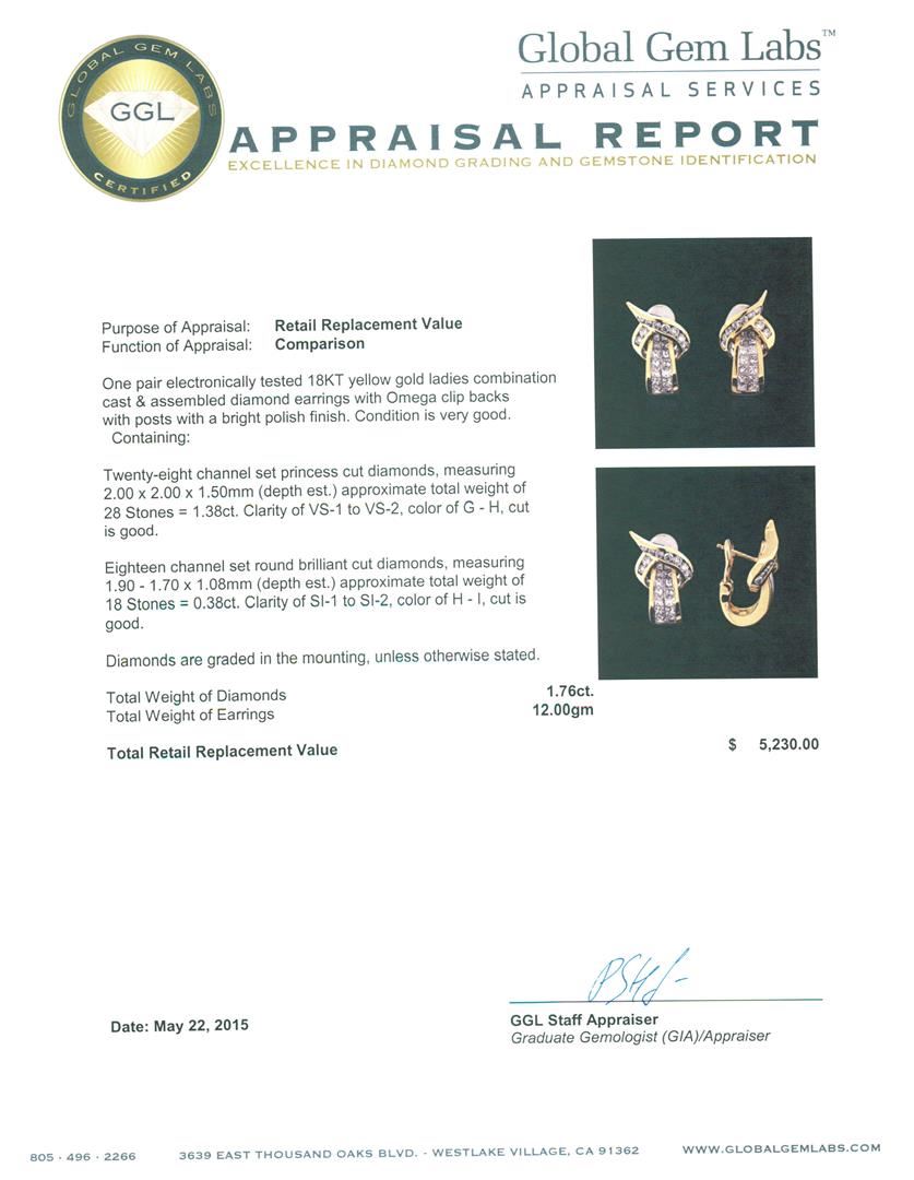 One pair electronically tested 18KT yellow gold ladies combination cast & assembled diamond earrings with Omega clip backs with posts with a bright polish finish. Condition is very good. Containing: Twenty-Eight channel set princess cut diamonds, measuring 2.00 x 2.00 x 1.50mm (depth est.) approximate total weight of 28 Stones = 1.38ct. Clarity: VS-1 to VS-2. Color: G - H, Cut is Good. Eighteen channel set round brilliant cut diamonds, measuring 1.90 - 1.70 x 1.08mm (depth est.) approximate total weight of 18 Stones = 0.38ct. Clarity: SI-1 to SI-2. Color: H - I, Cut is Good. Diamonds are graded in the mounting, unless otherwise stated. Total Weight of Diamonds 1.76ct. Total Weight of Earrings 12.00 grams. GGL Appraised at $5,230.00.