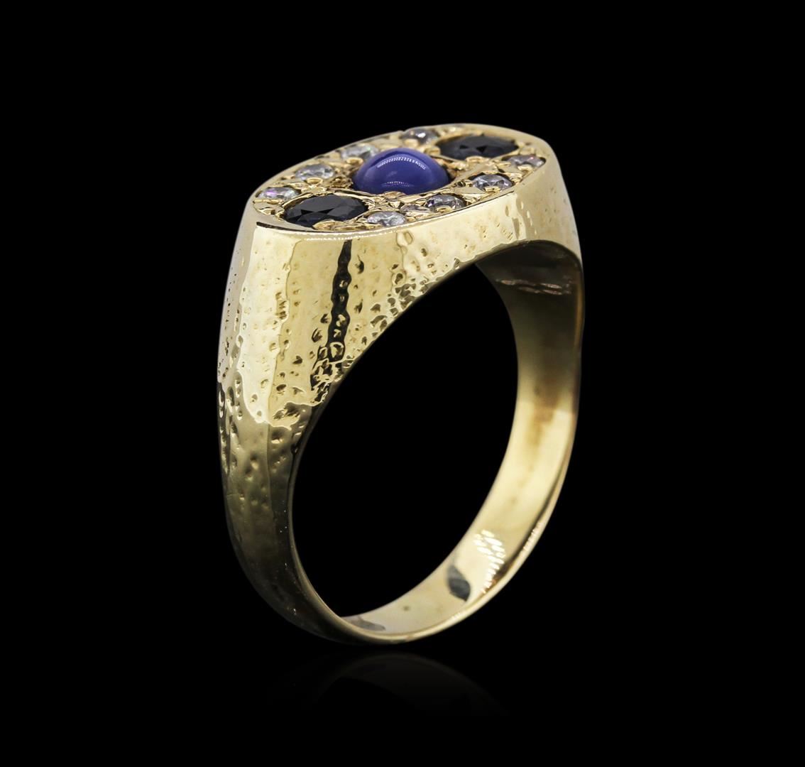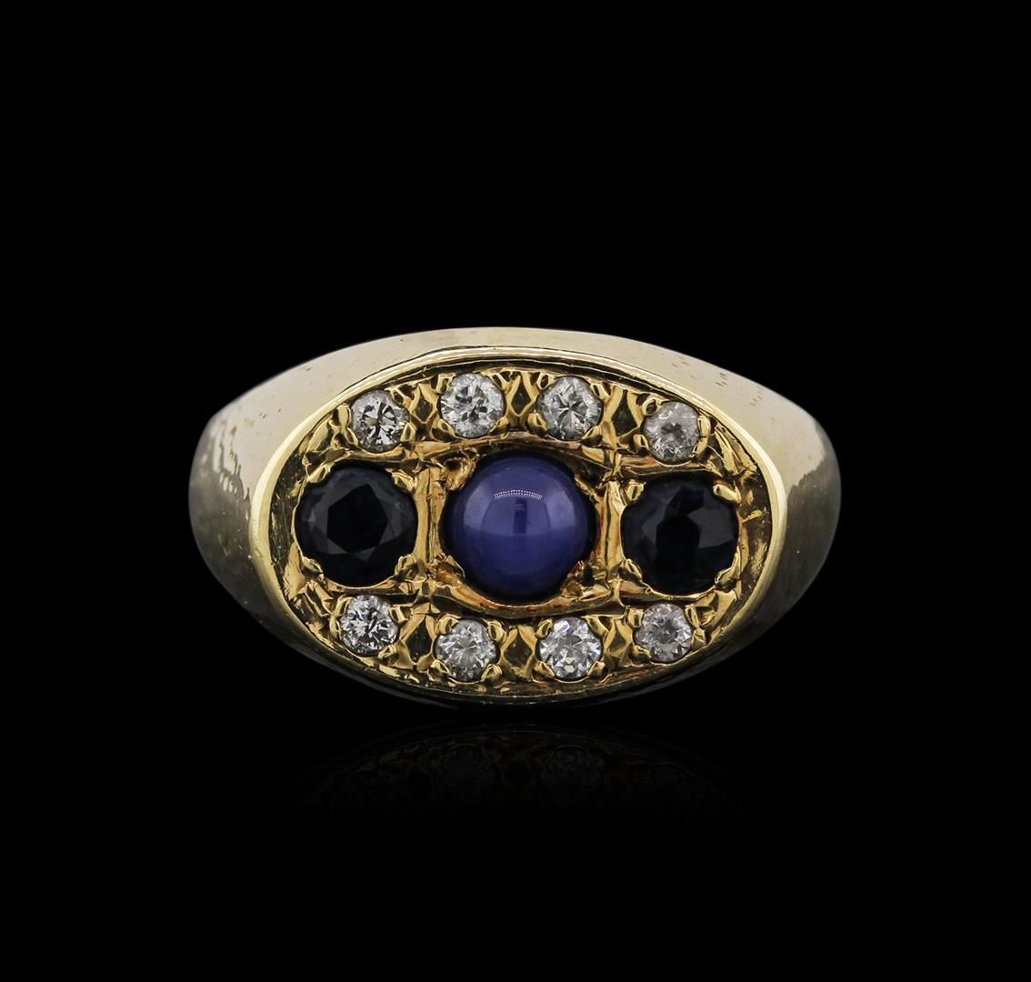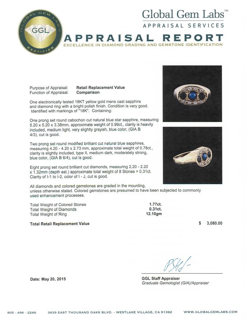 One electronically tested 18KT yellow gold mens cast sapphire and diamond ring with a bright polish finish. Identified with markings of "18K". Condition is very good. Containing: One prong set round cabochon cut natural blue star sapphire, measuring 5.20 x 5.20 x 3.38mm, approximate weight of 0.99ct., clarity is heavily included, medium light, very slightly grayish, blue color, (GIA B 4/3), cut is good. Two prong set round modified brilliant cut natural blue sapphires, measuring 4.20 - 4.20 x 2.73 mm, approximate total weight of 0.78ct., clarity is slightly included, type II, medium dark, moderately strong, blue color, (GIA B 6/4), cut is good. Eight prong set round brilliant cut diamonds, measuring 2.20 - 2.20 x 1.32mm (depth est.) approximate total weight of 8 Stones = 0.31ct. Clarity: I-1 to I-2. Color: I - J, Cut is Good. All diamonds and colored gemstones are graded in the mounting, unless otherwise stated. Colored gemstones are presumed to have been subjected to commonly used enhancement processes. Total Weight of Colored Stones 1.77ct. Total Weight of Diamonds 0.31ct. Total Weight of Ring 12.10 grams. GGL Appraised at $3,080.00.