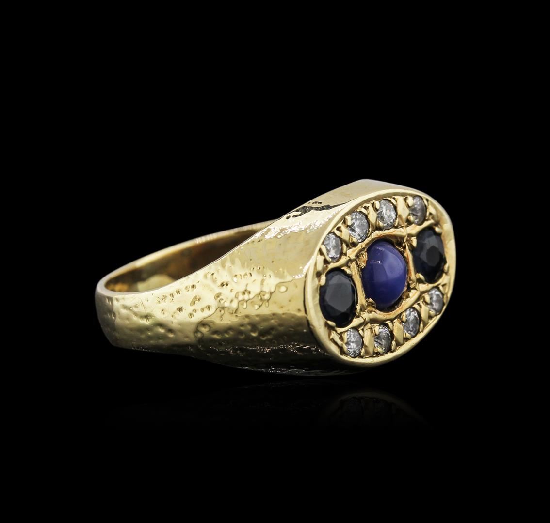One electronically tested 18KT yellow gold mens cast sapphire and diamond ring with a bright polish finish. Identified with markings of "18K". Condition is very good. Containing: One prong set round cabochon cut natural blue star sapphire, measuring 5.20 x 5.20 x 3.38mm, approximate weight of 0.99ct., clarity is heavily included, medium light, very slightly grayish, blue color, (GIA B 4/3), cut is good. Two prong set round modified brilliant cut natural blue sapphires, measuring 4.20 - 4.20 x 2.73 mm, approximate total weight of 0.78ct., clarity is slightly included, type II, medium dark, moderately strong, blue color, (GIA B 6/4), cut is good. Eight prong set round brilliant cut diamonds, measuring 2.20 - 2.20 x 1.32mm (depth est.) approximate total weight of 8 Stones = 0.31ct. Clarity: I-1 to I-2. Color: I - J, Cut is Good. All diamonds and colored gemstones are graded in the mounting, unless otherwise stated. Colored gemstones are presumed to have been subjected to commonly used enhancement processes. Total Weight of Colored Stones 1.77ct. Total Weight of Diamonds 0.31ct. Total Weight of Ring 12.10 grams. GGL Appraised at $3,080.00.