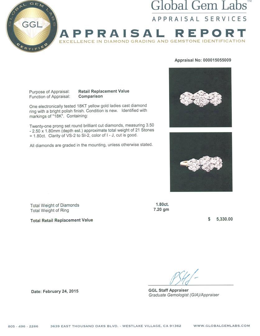 One electronically tested 18KT yellow gold ladies cast diamond ring with a bright polish finish. Identified with markings of "18K". Condition is new. Containing: Twenty-One prong set round brilliant cut diamonds, measuring 3.50 - 2.50 x 1.80mm (depth est.) approximate total weight of 21 Stones = 1.80ct. Clarity: VS-2 to SI-2. Color: I - J, Cut is Good. All diamonds are graded in the mounting, unless otherwise stated. Total Weight of Diamonds 1.80ct. Total Weight of Ring 7.20 grams. GGL Appraised at $5,330.00.