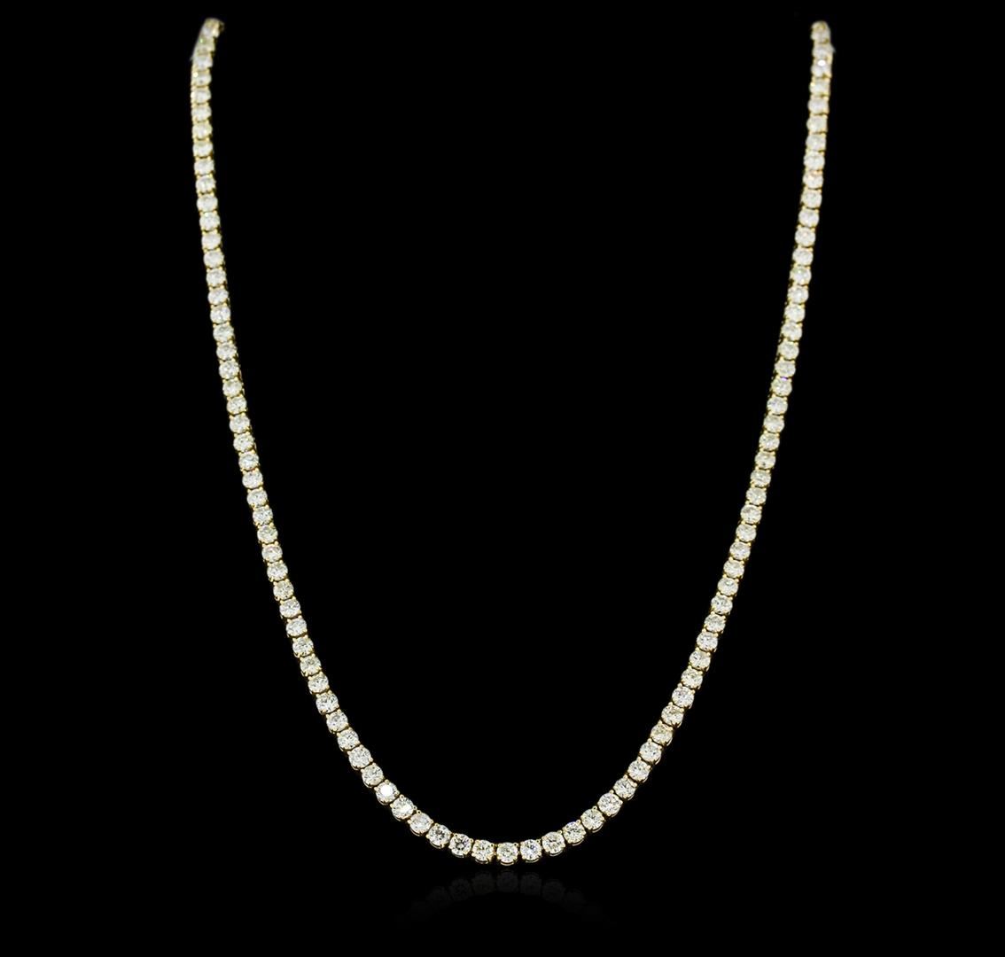 One electronically tested 18KT yellow gold ladies cast diamond necklace with a hidden box clasp with safety closer with a bright polish finish. Measurements: 16.50" in length Identified with markings of "K18". Condition is new. Containing: One Hundred Twenty-Nine prong set round brilliant cut diamonds, measuring 3.00 - 2.90 x 1.77mm (depth est.) approximate total weight of 129 Stones = 12.11ct. Clarity: SI-1 to I-1. Color: J - L, Cut is Good. All diamonds are graded in the mounting, unless otherwise stated. Total Weight of Diamonds 12.11ct. Total Weight of Necklace 22.60 grams. GGL Appraised at $20,085.00.