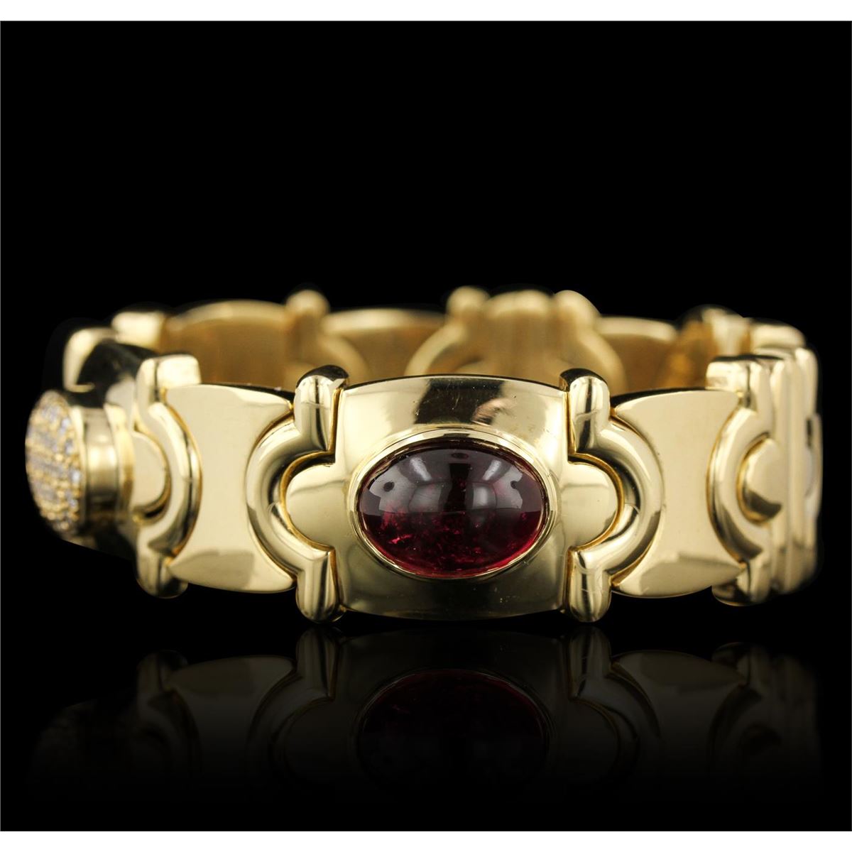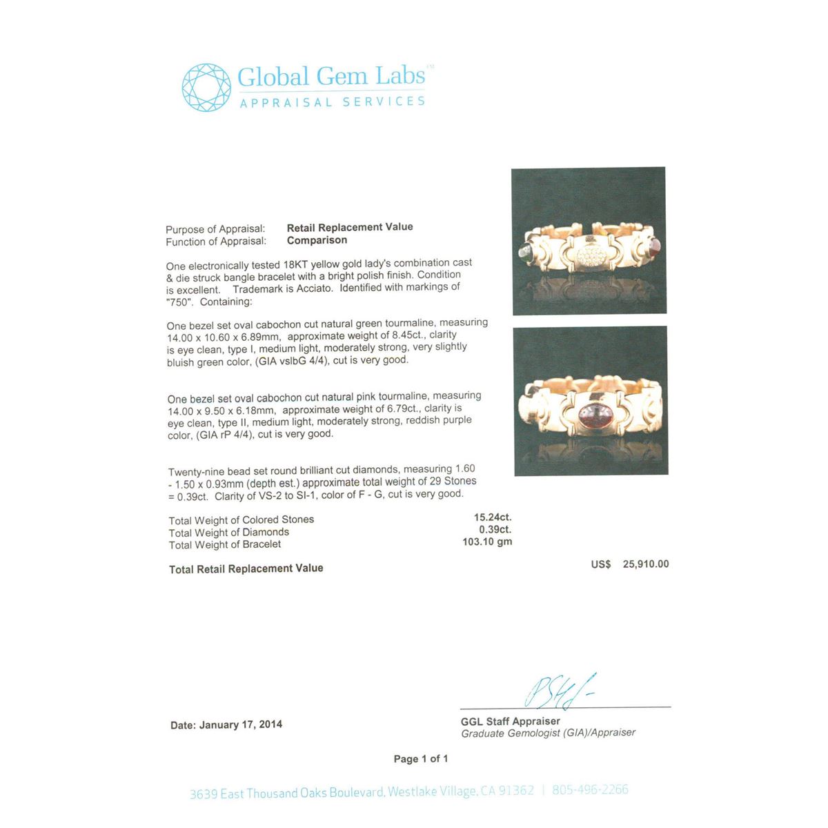 One electronically tested 18KT yellow gold Ladies combination cast & die struck bangle bracelet with a bright polish finish. Trademark is Acciato. Identified with markings of "750". Condition is excellent. Containing: One bezel set oval cabochon cut natural green tourmaline, measuring 14.00 x 10.60 x 6.89mm, approximate weight of 8.45ct., clarity is eye clean, type I, medium light, moderately strong, very slightly bluish green color, (GIA vslbG 4/4), cut is very good. One bezel set oval cabochon cut natural pink tourmaline, measuring 14.00 x 9.50 x 6.18mm, approximate weight of 6.79ct., clarity is eye clean, type II, medium light, moderately strong, reddish purple color, (GIA rP 4/4), cut is very good. Twenty-Nine bead set round brilliant cut diamonds, measuring 1.60 - 1.50 x 0.93mm (depth est.) approximate total weight of 29 Stones = 0.39ct. Clarity of VS-2 to SI-1, Color of F - G, Cut is Very Good. Total Weight of Colored Stones 15.24ct. Total Weight of Diamonds 0.39ct. Total Weight of Bracelet 103.10gm. GGL Appraised at $25,910.00.