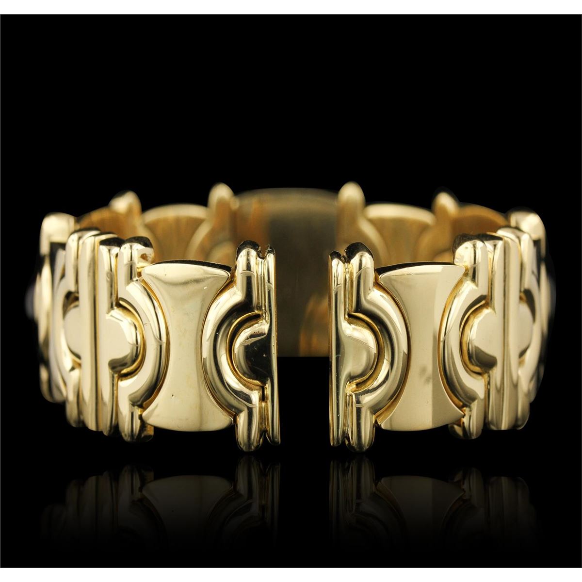 One electronically tested 18KT yellow gold Ladies combination cast & die struck bangle bracelet with a bright polish finish. Trademark is Acciato. Identified with markings of "750". Condition is excellent. Containing: One bezel set oval cabochon cut natural green tourmaline, measuring 14.00 x 10.60 x 6.89mm, approximate weight of 8.45ct., clarity is eye clean, type I, medium light, moderately strong, very slightly bluish green color, (GIA vslbG 4/4), cut is very good. One bezel set oval cabochon cut natural pink tourmaline, measuring 14.00 x 9.50 x 6.18mm, approximate weight of 6.79ct., clarity is eye clean, type II, medium light, moderately strong, reddish purple color, (GIA rP 4/4), cut is very good. Twenty-Nine bead set round brilliant cut diamonds, measuring 1.60 - 1.50 x 0.93mm (depth est.) approximate total weight of 29 Stones = 0.39ct. Clarity of VS-2 to SI-1, Color of F - G, Cut is Very Good. Total Weight of Colored Stones 15.24ct. Total Weight of Diamonds 0.39ct. Total Weight of Bracelet 103.10gm. GGL Appraised at $25,910.00.