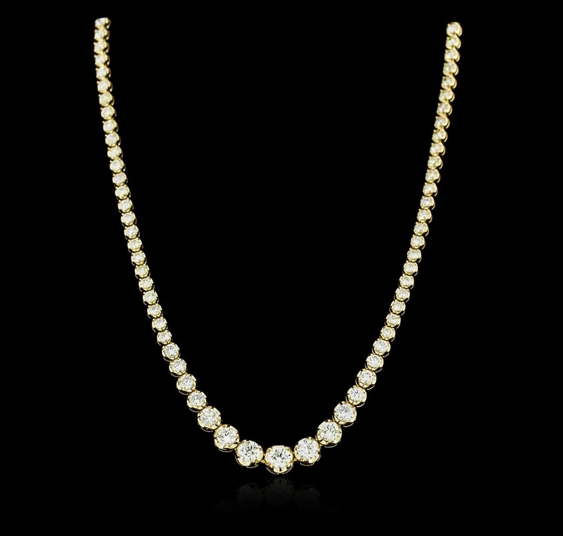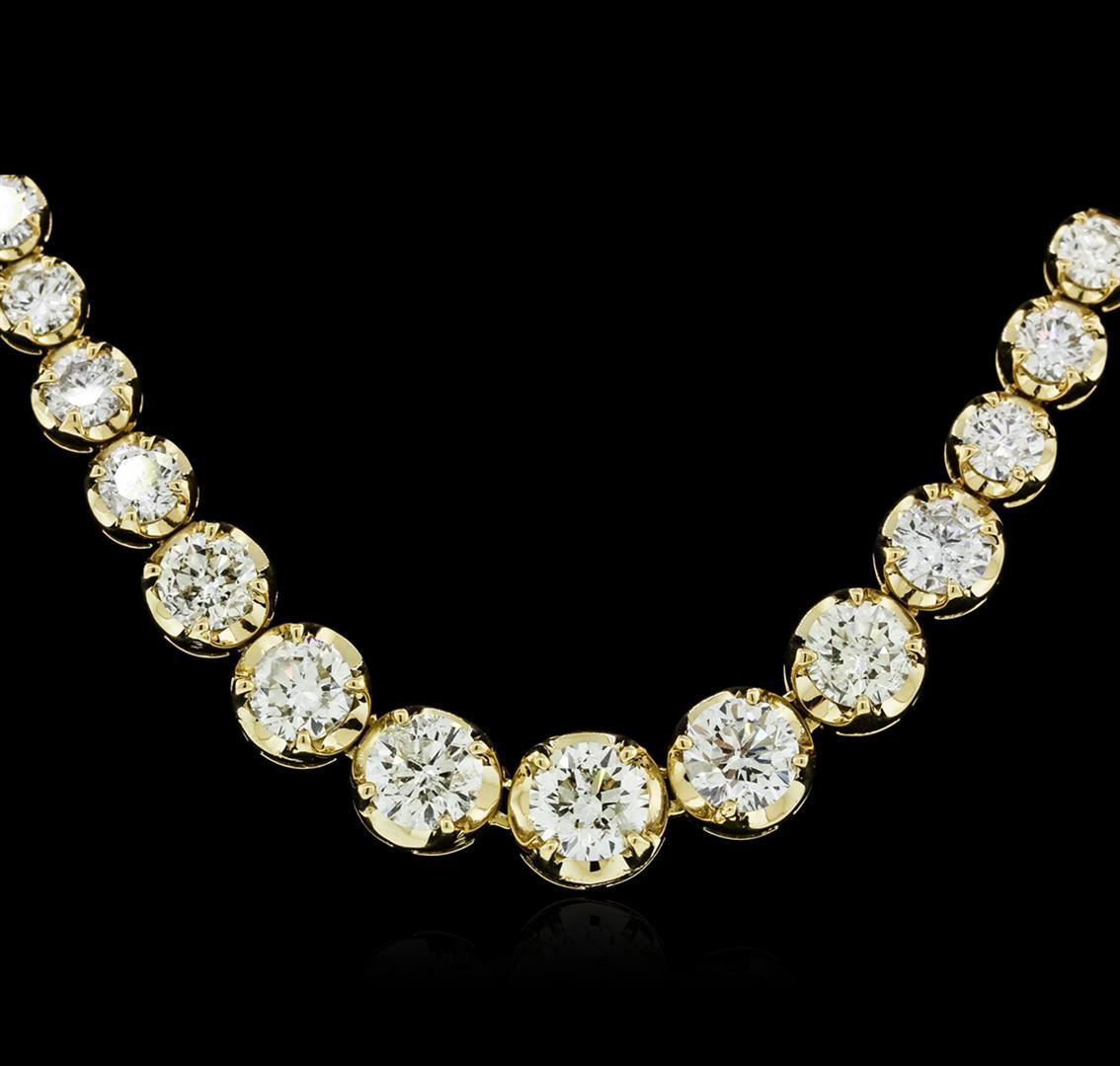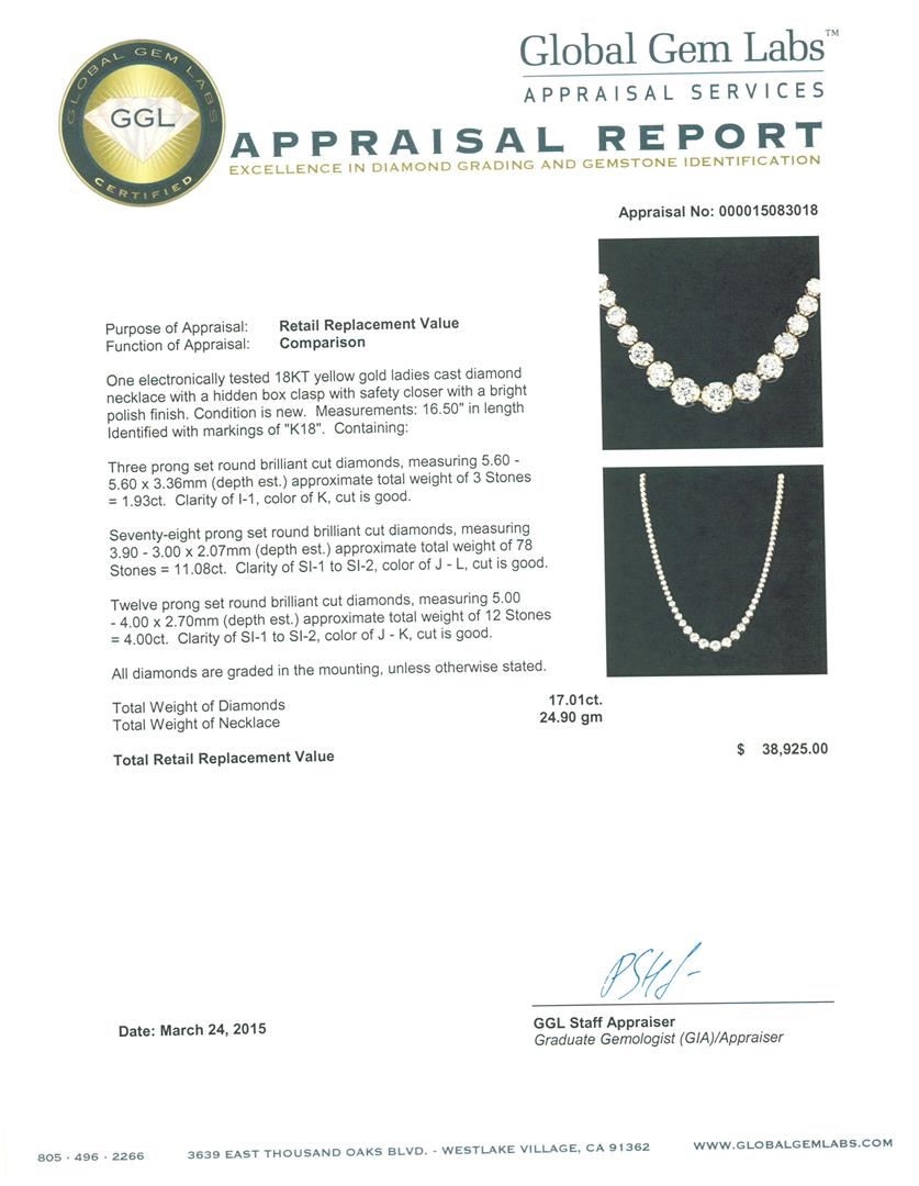 One electronically tested 18KT yellow gold ladies cast diamond necklace with a hidden box clasp with safety closer with a bright polish finish. Measurements: 16.50" in length Identified with markings of "K18". Condition is new. Containing: Three prong set round brilliant cut diamonds, measuring 5.60 - 5.60 x 3.36mm (depth est.) approximate total weight of 3 Stones = 1.93ct. Clarity: I-1. Color: K, Cut is Good. Seventy-Eight prong set round brilliant cut diamonds, measuring 3.90 - 3.00 x 2.07mm (depth est.) approximate total weight of 78 Stones = 11.08ct. Clarity: SI-1 to SI-2. Color: J - L, Cut is Good. Twelve prong set round brilliant cut diamonds, measuring 5.00 - 4.00 x 2.70mm (depth est.) approximate total weight of 12 Stones = 4.00ct. Clarity: SI-1 to SI-2. Color: J - K, Cut is Good. All diamonds are graded in the mounting, unless otherwise stated. Total Weight of Diamonds 17.01ct. Total Weight of Necklace 24.90 grams. GGL Appraised at $38,925.00.