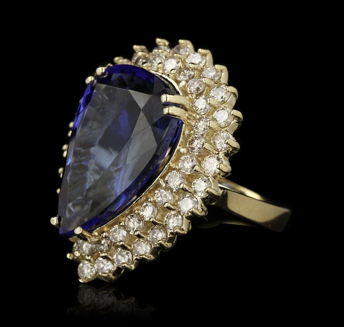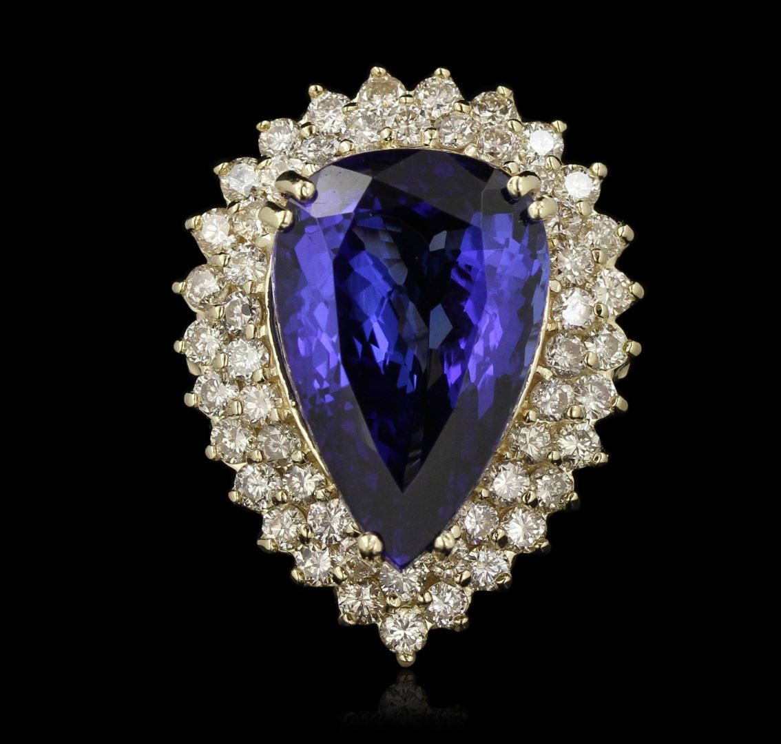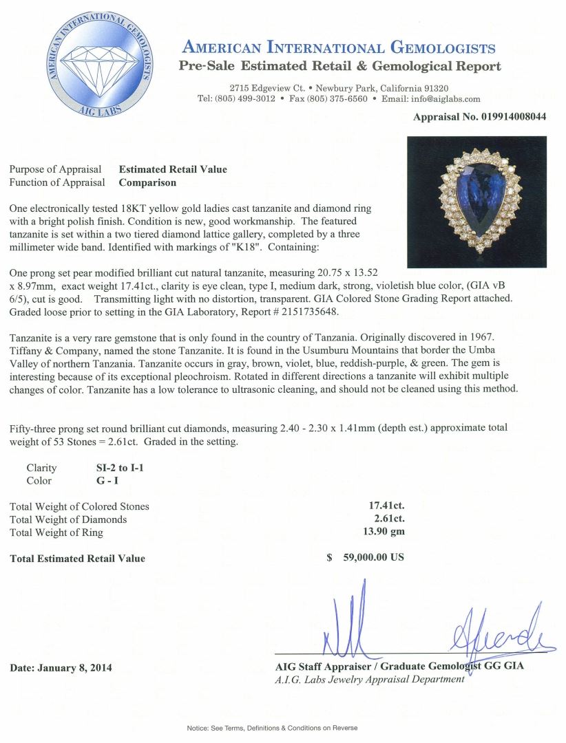 One electronically tested 18KT yellow gold ladies cast tanzanite and diamond ring with a bright polish finish. The featured tanzanite is set within a two tiered diamond lattice gallery, completed by a three millimeter wide band. Identified with markings of "K18". Condition is new, good workmanship. Containing: One prong set pear modified brilliant cut natural tanzanite, measuring 20.75 x 13.52 x 8.97mm, exact weight 17.41ct., clarity is eye clean, type I, medium dark, strong, violetish blue color, (GIA vB 6/5), cut is good. Transmitting light with no distortion, transparent. GIA Colored Stone Grading Report attached. Graded loose prior to setting in the GIA Laboratory, Report # 2151735648.Tanzanite is a very rare gemstone that is only found in the country of Tanzania. Originally discovered in 1967. Tiffany & Company, named the stone Tanzanite. It is found in the Usumburu Mountains that border the Umba Valley of northern Tanzania. Tanzanite occurs in gray, brown, violet, blue, reddish-purple, & green. The gem is interesting because of its exceptional pleochroism. Rotated in different directions a tanzanite will exhibit multiple changes of color. Tanzanite has a low tolerance to ultrasonic cleaning, and should not be cleaned using this method. Fifty-Three prong set round brilliant cut diamonds, measuring 2.40 - 2.30 x 1.41mm (depth est.) approximate. Total Weight of 53 Stones = 2.61ct. Graded in the setting. Clarity: SI-2 to I-1 . Color: G - I. Total Weight of Colored Stones 17.41ct. Total Weight of Diamonds 2.61ct. AIG Appraised at $59,000.00.