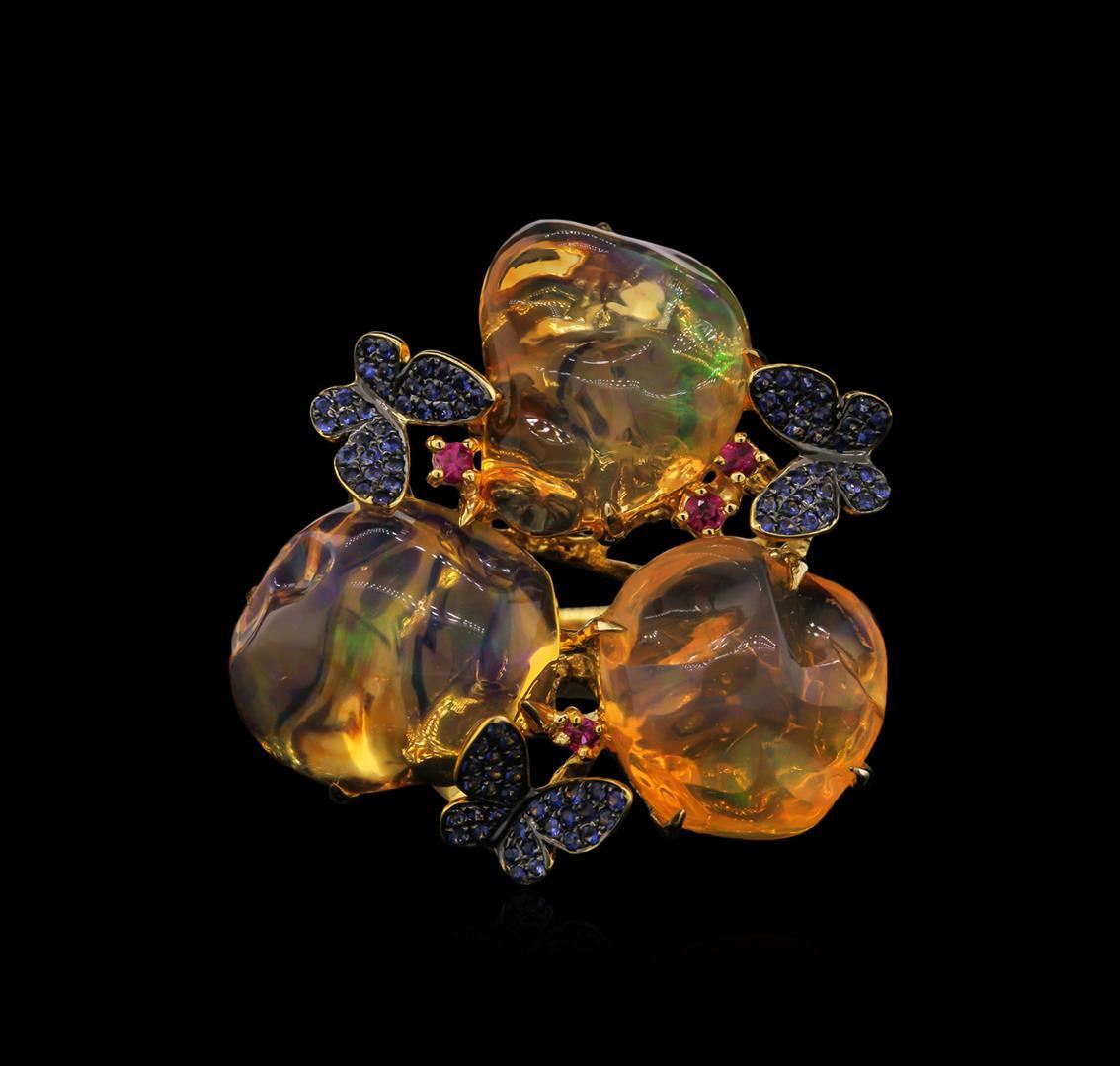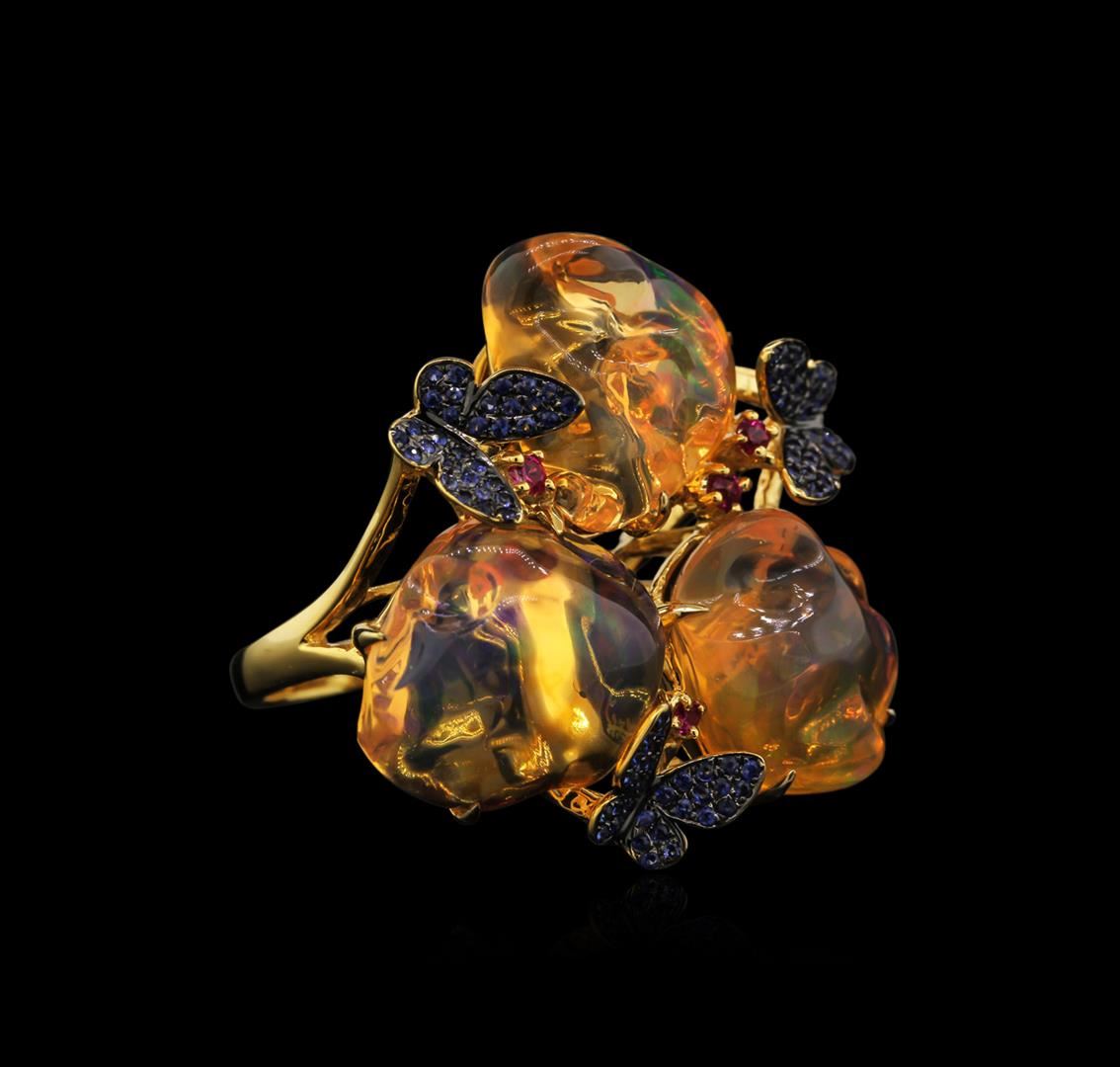 One electronically tested 18KT yellow gold ladies cast opal, sapphire and ruby ring with a bright polish finish. Identified with markings of "18K". Condition is new. Containing: Three fire opals that are cut in a free-form shaped and are prong set, measuring 13.20 mm long x 13.10 mm wide, and 8.18 mm thick and the approximate weight is 18.26ct., The opals have a bright, green-orange play of color (fire) in a flashfire pattern; a dome; a good cut; no inclusions; slight variation in base in their brightness and pattern; and are very directional. Thirty-five prong set round modified brilliant cut natural blue sapphires, measuring 1.10 - 1.10 x 0.72 mm, approximate total weight of 0.17ct., clarity is slightly included, type II, medium, moderately strong, blue color, (GIA B 5/4), cut is good. Three prong set round modified brilliant cut natural rubies, measuring 1.40 - 1.40 x 0.91 mm, approximate total weight of 0.03ct., clarity is slightly included, medium, moderately strong, purple red color, (GIA PR 5/4), cut is good. Colored gemstones are presumed to have been subjected to commonly used enhancement processes. All diamonds and colored gemstones are graded in the mounting, unless otherwise stated. Total Weight of Colored Stones 0.20ct. Total Weight of Ring 15.60 grams. GGL Appraised at $5,220.00.