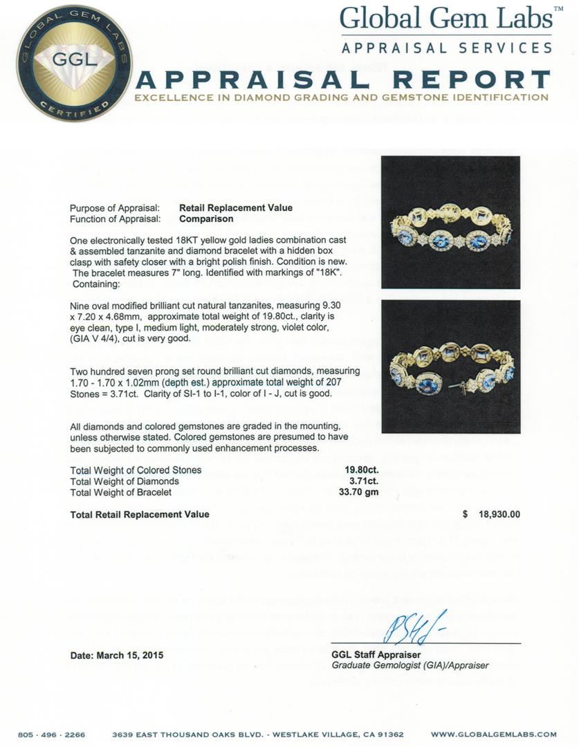 One electronically tested 18KT yellow gold ladies combination cast & assembled tanzanite and diamond bracelet with a hidden box clasp with safety closer with a bright polish finish. The bracelet measures 7" long. Identified with markings of "18K". Condition is new. Containing: Nine oval modified brilliant cut natural tanzanites, measuring 9.30 x 7.20 x 4.68mm, approximate total weight of 19.80ct., clarity is eye clean, type I, medium light, moderately strong, violet color, (GIA V 4/4), cut is very good. Two Hundred Seven prong set round brilliant cut diamonds, measuring 1.70 - 1.70 x 1.02mm (depth est.) approximate total weight of 207 Stones = 3.71ct. Clarity of SI-1 to I-1, Color of I - J, Cut is Good. All diamonds and colored gemstones are graded in the mounting, unless otherwise stated. Colored gemstones are presumed to have been subjected to commonly used enhancement processes. Total Weight of Colored Stones 19.80ct. Total Weight of Diamonds 3.71ct. Total Weight of Bracelet 33.70 grams. GGL Appraised at $18,930.00.