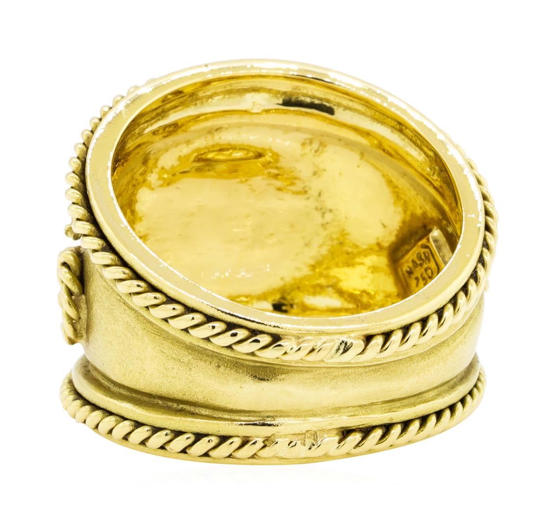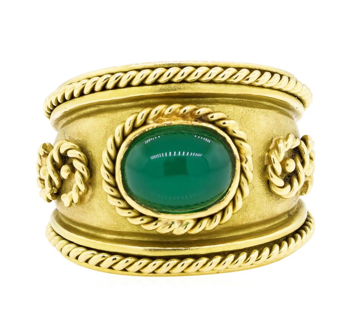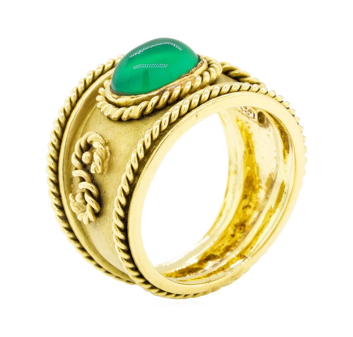 One ring featuring: 18KT yellow gold 12.2 grams containing one cabochon chalcedony weighing 2.00ct. The ring is a size 7.5.